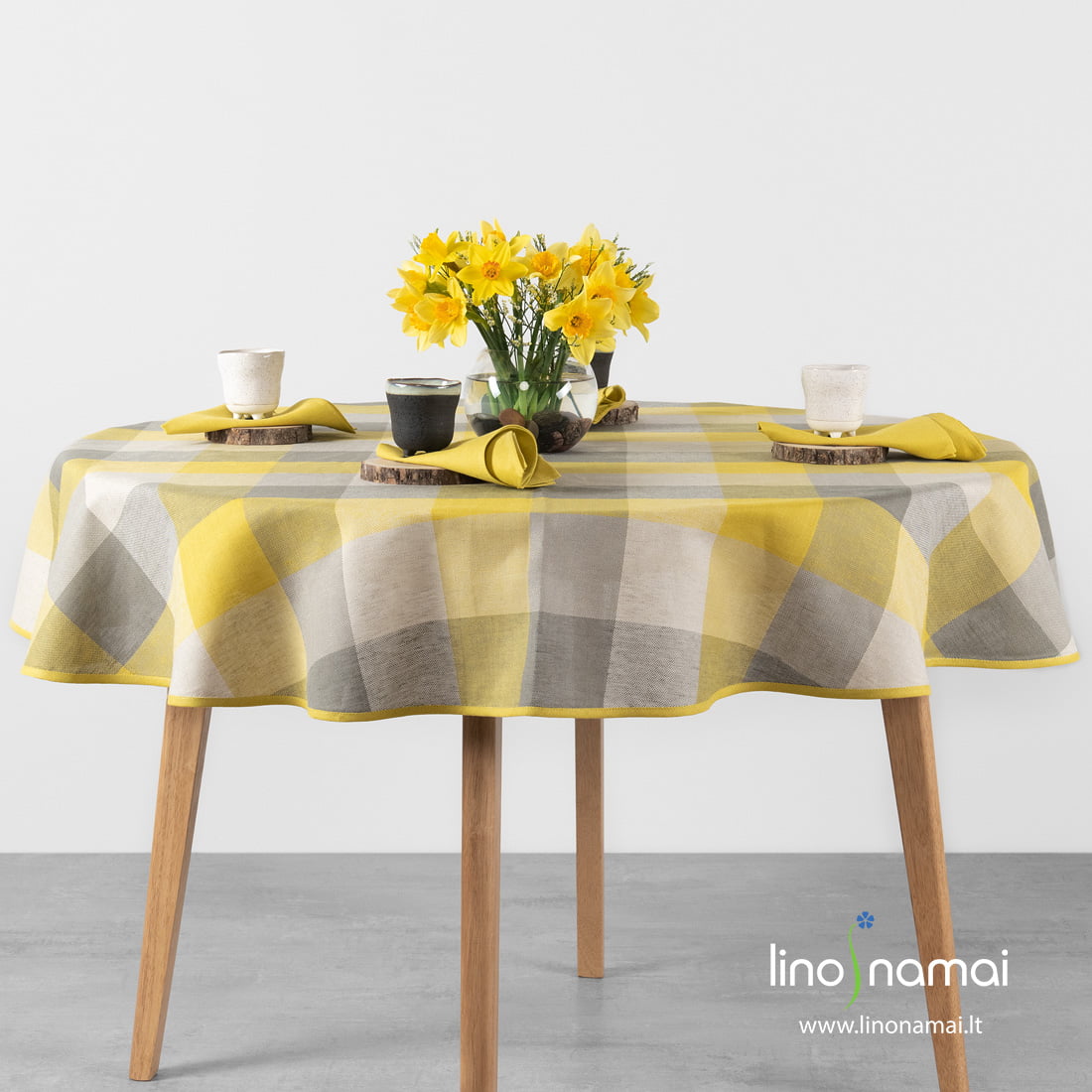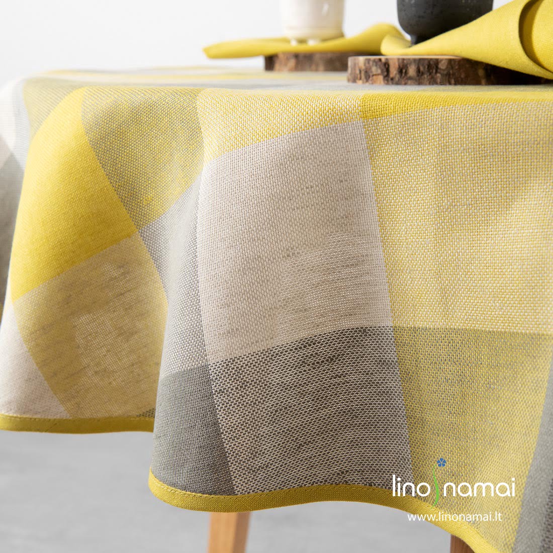 Apvali (ovali) puslininė geltonai-pilkai languota staltiesė. Jos lino-medvilnės sudėties audinį dideliais langeliais (10cm x 10cm) išaudėme iš baltų, skaisčiai geltonų, žalsvai pilkų ir šviesiai pilkų verpalų. Gaminį įrėminome vienspalviu geltonu kanteliu. Pasiuvome ir derančias geltonas servetėles, jas rasite mūsų parduotuvėje. Kontrastingas ryškiai geltonos ir ramios pilkos derinys labai tiks ant kasdienio pietų ar vakarienės stalo!