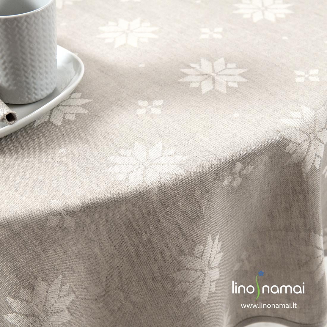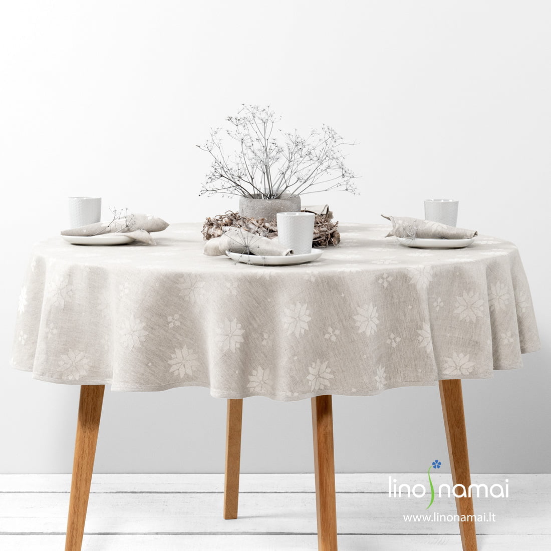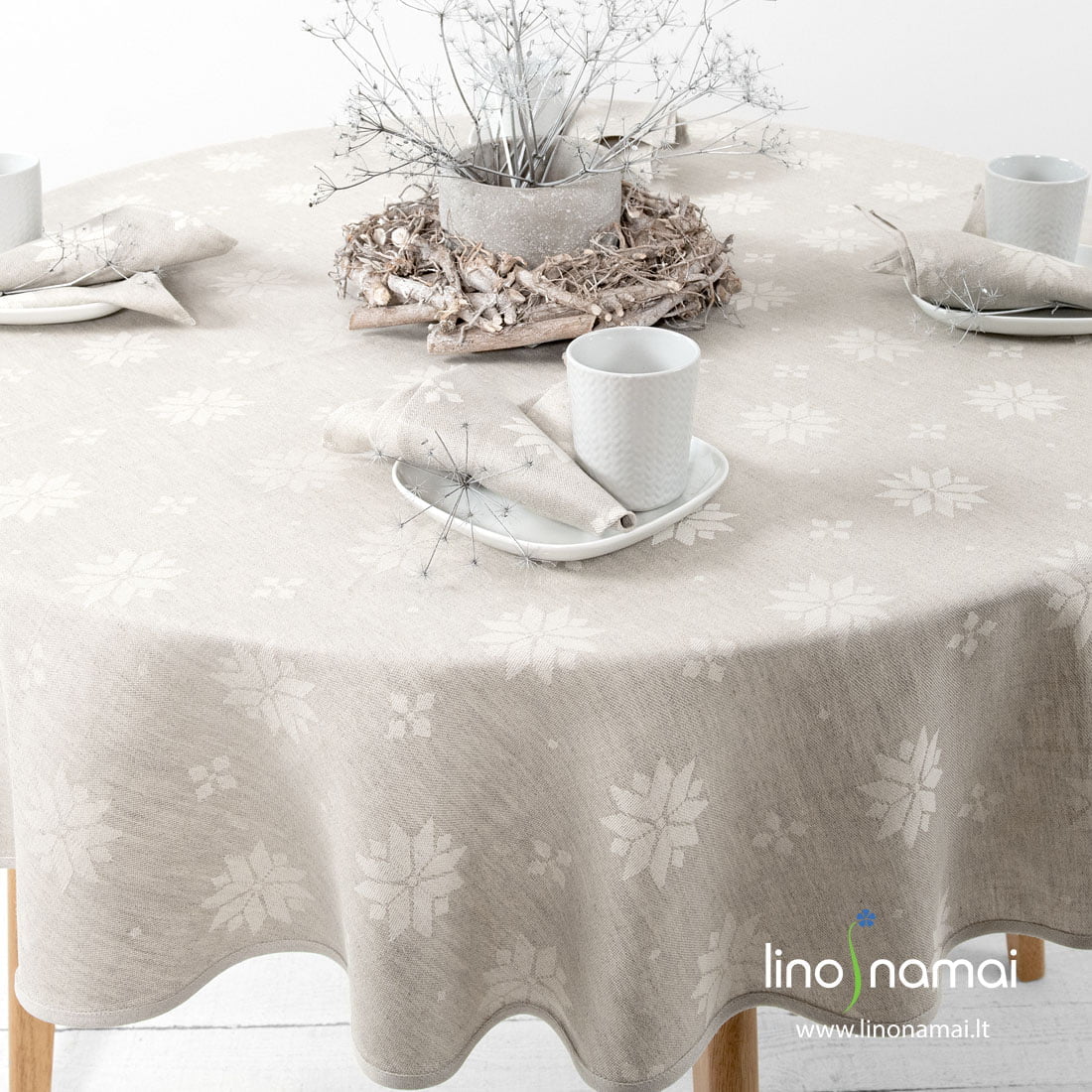 Apvali (ovali) puslininė šviesiai pilka staltiesė su žvaigždėmis iš žakardinio audinio, išausto iš natūralios pilkos spalvos (nedažytų) lino ir baltos spalvos medvilnės verpalų. Gaminį apsiuvome spalviškai derančiu šviesiai pilku kanteliu. Jei norėtumėte, kad Jūsų stalo dekore vyrautų balta spalva, tereikia apversti šią staltiesę: kita jos pusė balta su pilkomis žvaigždėmis. Pridėkite ir to paties audinio žvaigždėtas servetėles - šventėms pasiruošta!