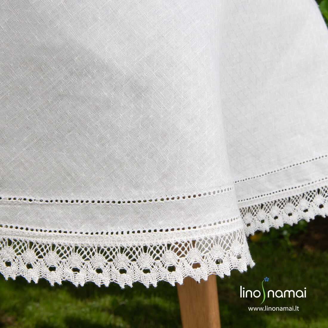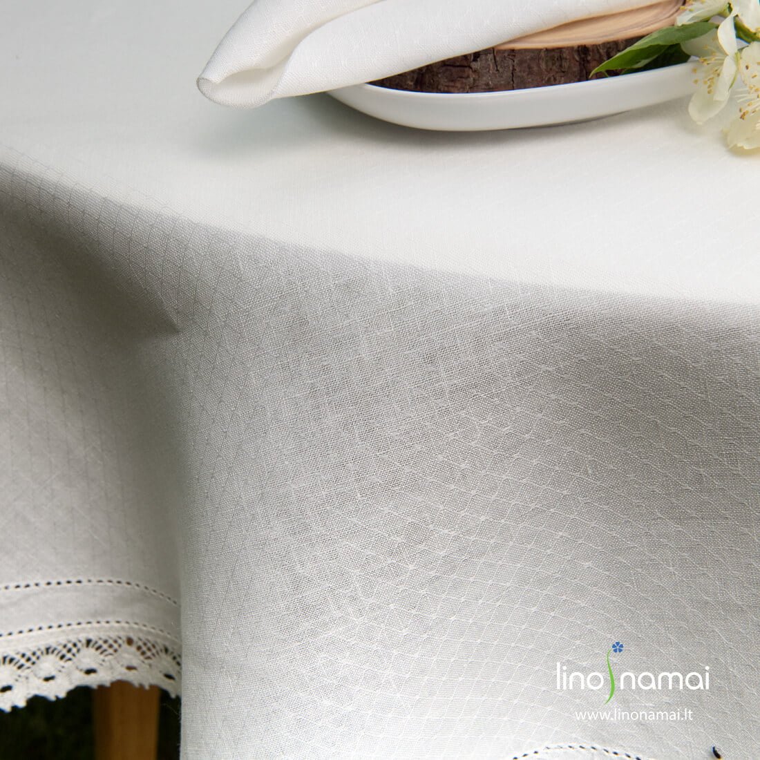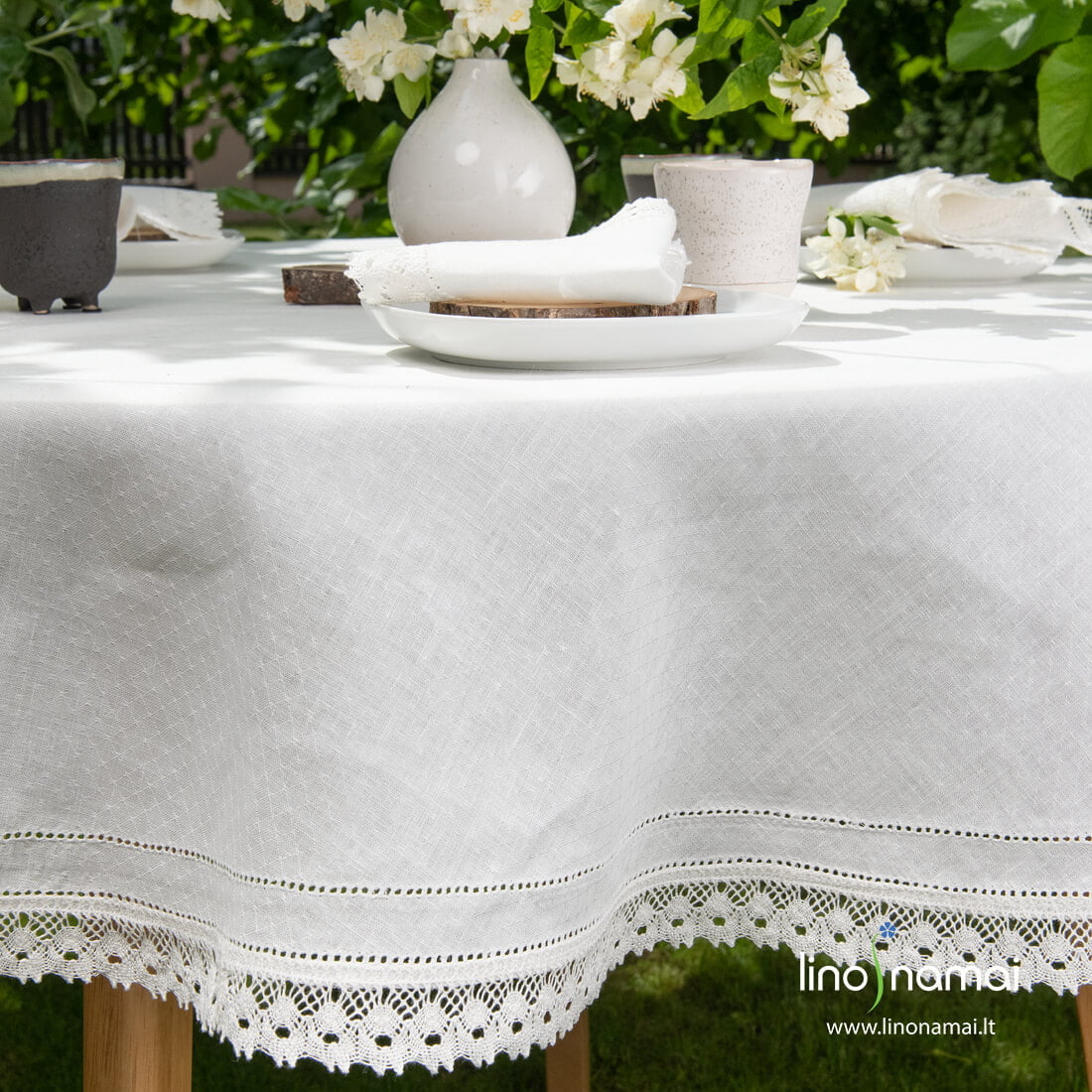 Pieno baltumo (gelsvai balta) apvali, ovali lininė staltiesė su nėriniais ir dviem mereškuotomis eilutėmis aplink. Gaminio audinys raštuotas: austas smulkiais rombeliais. Prabangos jausmą kuriantys dailūs lininiai nėriniai ir subtilus audinio raštas dekoruos Jūsų vaišių stalą tiesiog nepriekaištingai! Įsigykite ir tokio paties audinio servetėles.