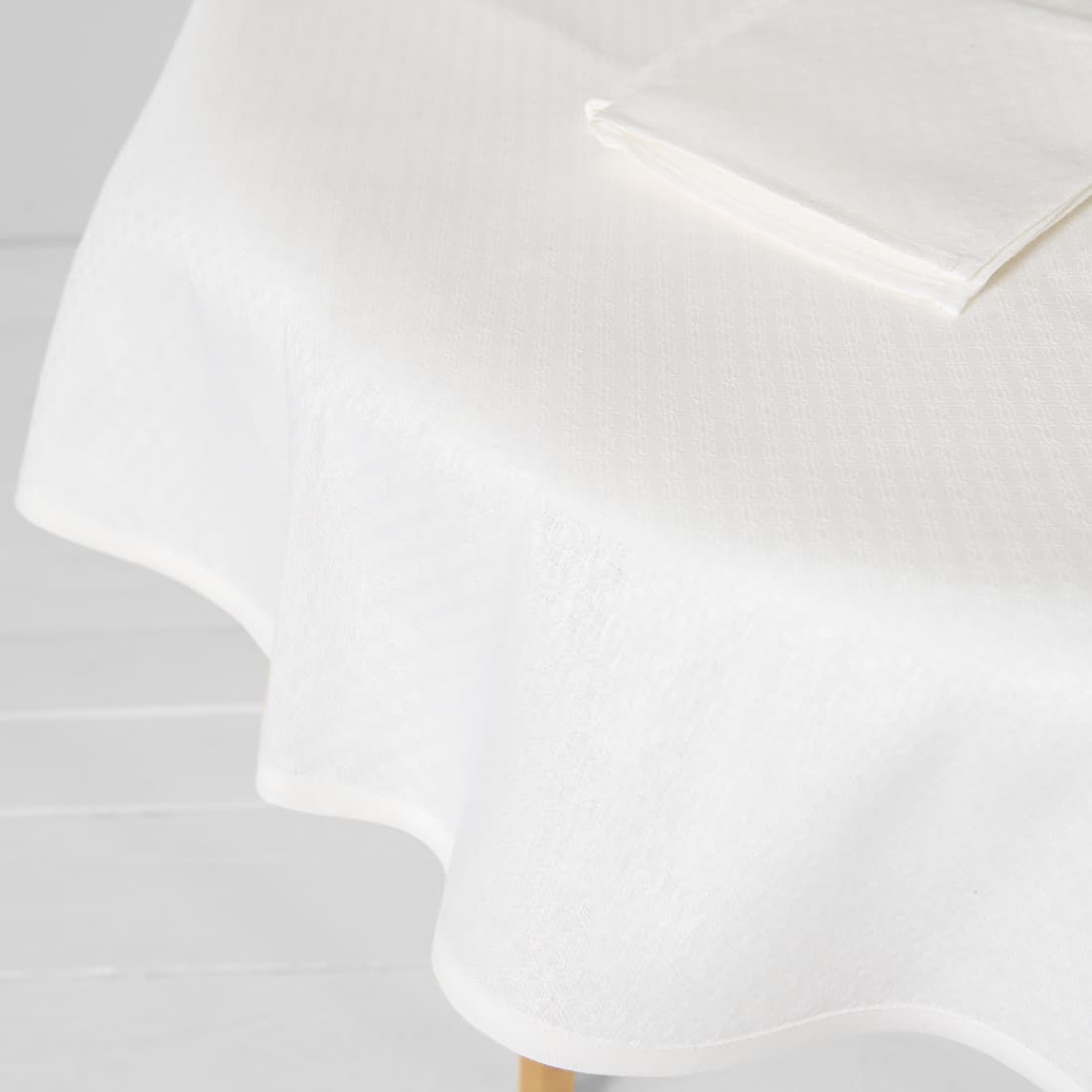 Apvali (ovali) ryškiai balta raštuota lino / medvilnės staltiesė, kurios kraštelis puoštas balto audinio kanteliu. Austa mažais rombeliais, kurių susikirtimo vietose išryškėja gėlytės. Ryškiai balta staltiesė suteikia nepriekaištingos švaros ir šviesos įspūdį. Serviruojant stalą siūlome derinti su tokio paties rašto bei spalvos servetėlėmis.
