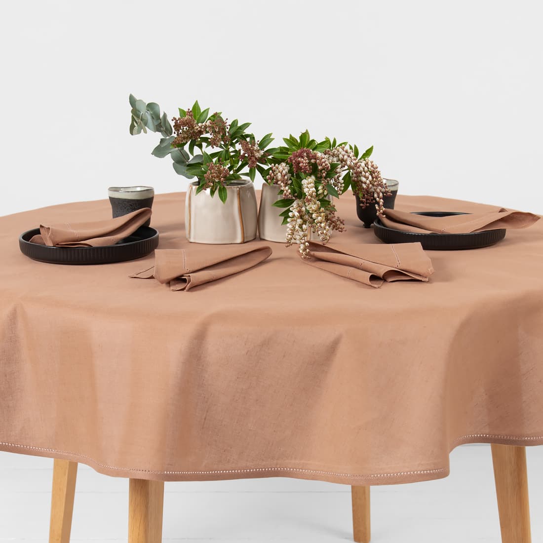 • Apvali (ovali) šviesiai ruda lino-medvilnės sudėties staltiesė