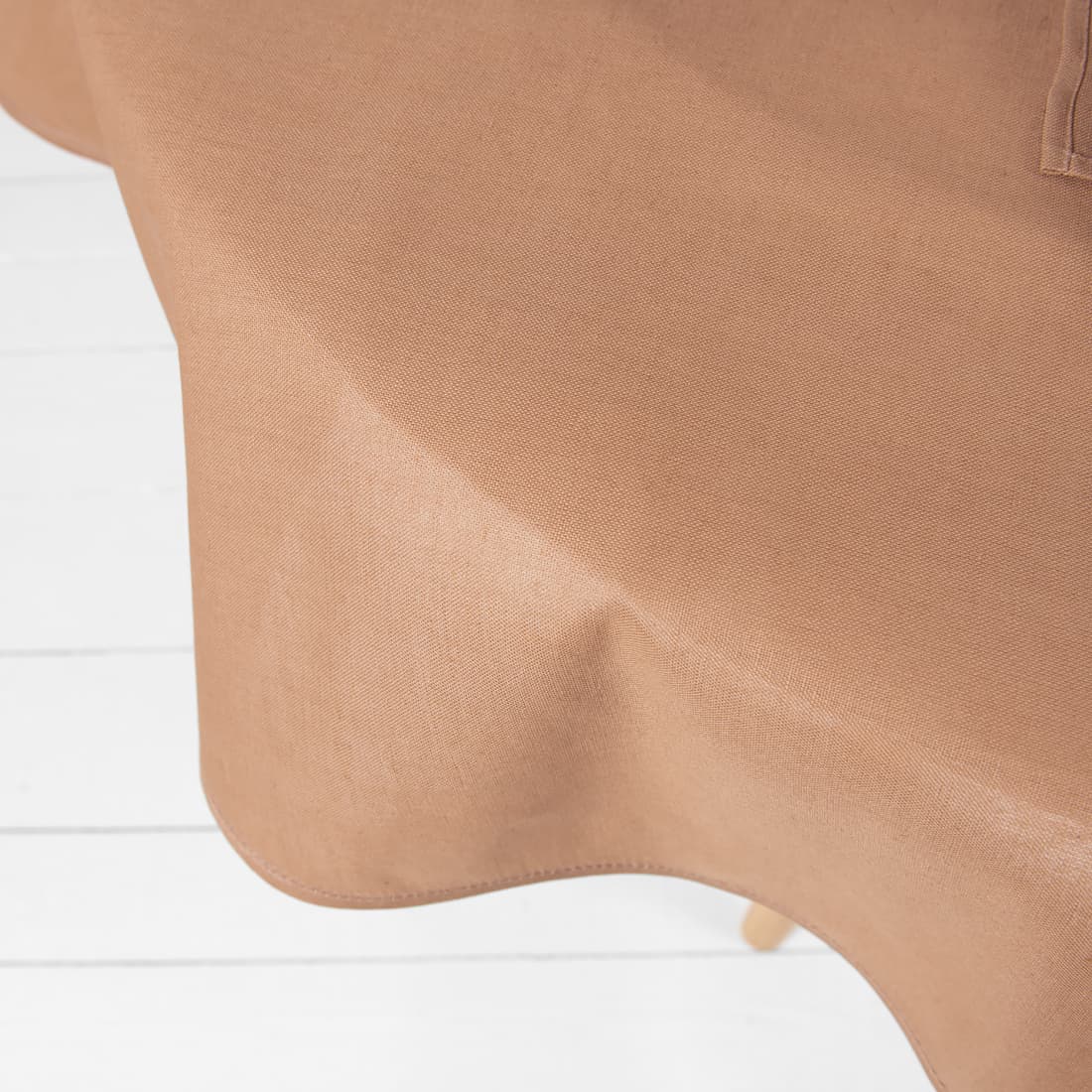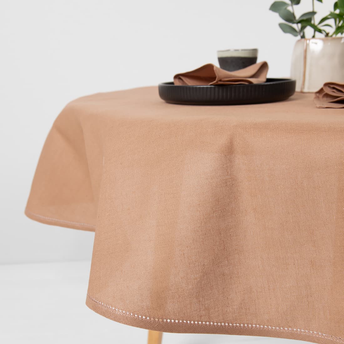 • Apvali (ovali) šviesiai ruda lino-medvilnės staltiesė su mereškuotu kraštu