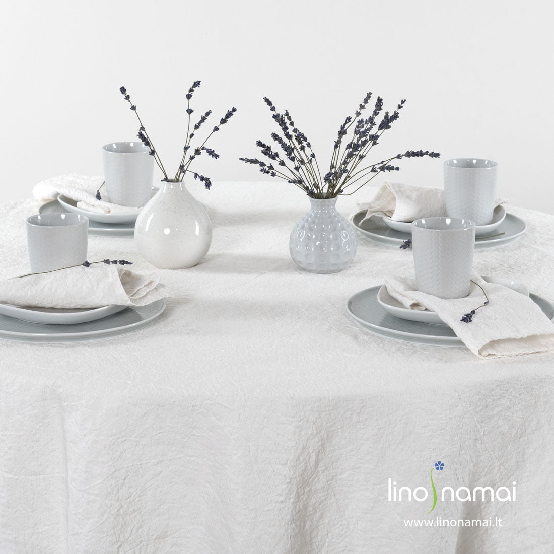 Pieno baltumo (gelsvai balta) lino - medvilnės servetėlė, pagyvinta dryžiukais iš specialių (su tam tikrais sustorėjimais) verpalų. Gaminio audinys minkštas, švelnus, nes skalbtas ypatinga technologija. Lyginti nebūtina, tegul servetėlė lieka nerūpestingai pasiglamžiusi. Servetėlių rinkinys ir apvali staltiesė iš to paties audinio - graži dovana bet kokia proga.