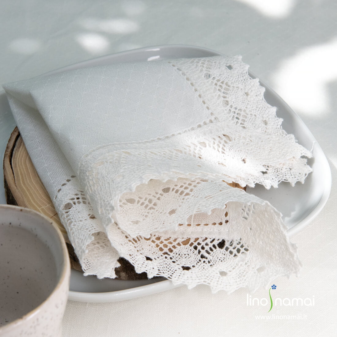 Balta raštuota lininė servetėlė su nėriniu, mereškuota viena dailia eilute visose kraštinėse. Mažų rombų raštas, suteikiantis gaminiui žaismingumo, 100% lino audinys ir subtilūs nėriniai daro šią servetėlę nepakartojama stalo puošmena. Jei norėtumėte viso komplekto, turime ir kvadratinę, apvalią, ovalią staltieses iš tokio paties audinio, dekoruotas nėriniais. Nieko nėra subtiliau už švarią baltą spalvą ir prabangų lino nėrinį. Įsigykite gražiausioms Jūsų šeimos šventėms!