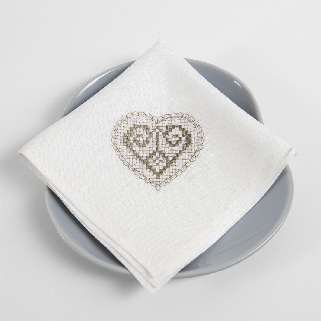 - Detalės: rusvai pilkšvu siūlu išsiuvinėta širdutė (piešinio dydis 75mm x 83mm)