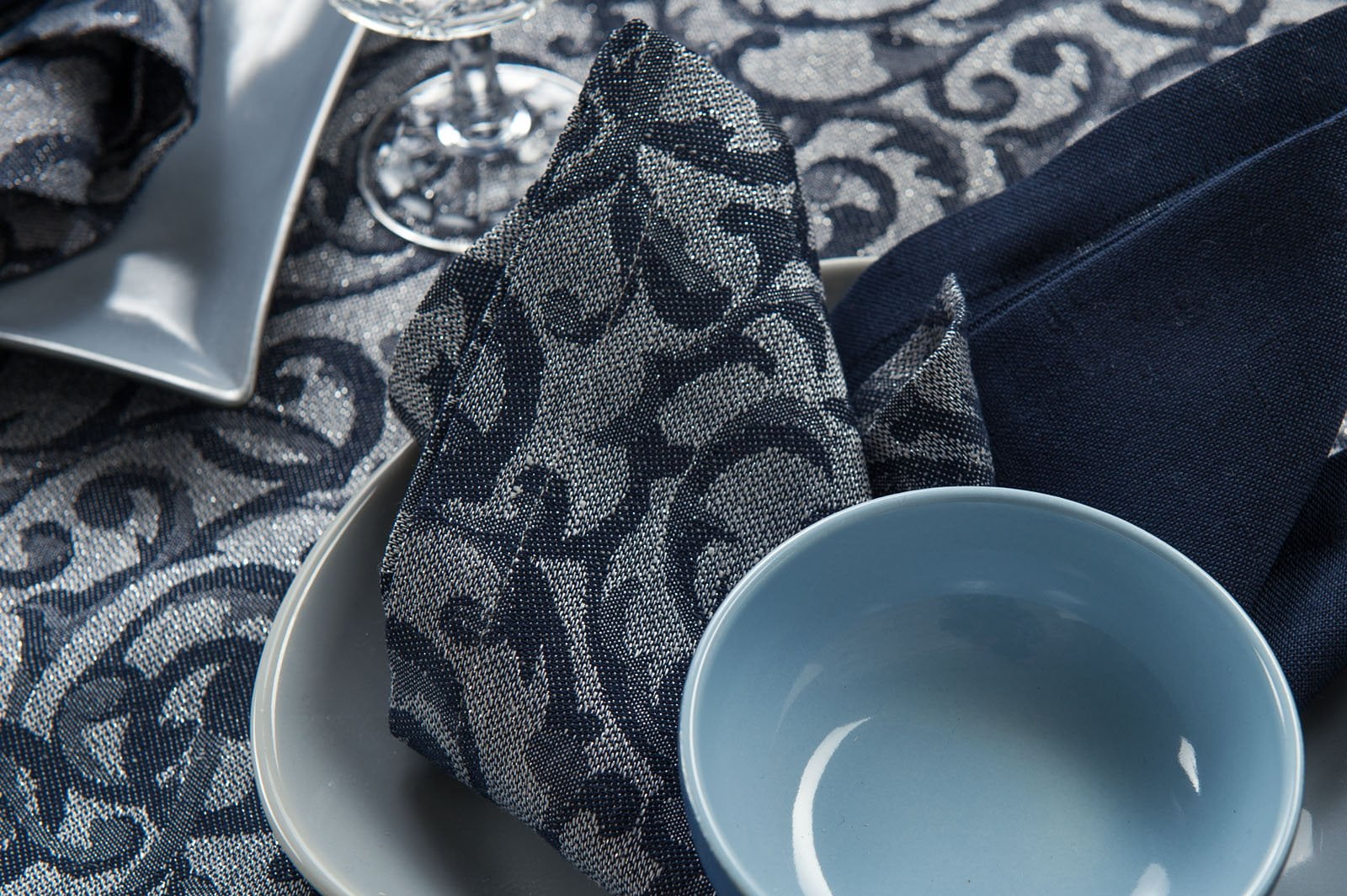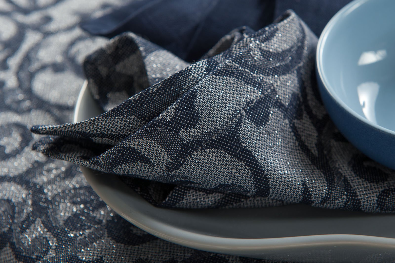 Žakardinės lino - medvilnės audinio servetėlės audinys austas apvalių formų, šerkšno motyvų raštu. Derinti tamsiai mėlynos ir melsvai pilkos spalvos verpalai ir sidabrinės spalvos poliesterio siūlai. Prie šerkšno temos puikiai derantis blizgesys nuteiks šventiškai, sukurs prabangią aurą Jūsų valgomajame. Jei reikia dar daugiau spindesio, įsigykite ir blizgančią raštuotą staltiesę. Prabangus stalo dekoras tikrai sužavės Jūsų svečius!