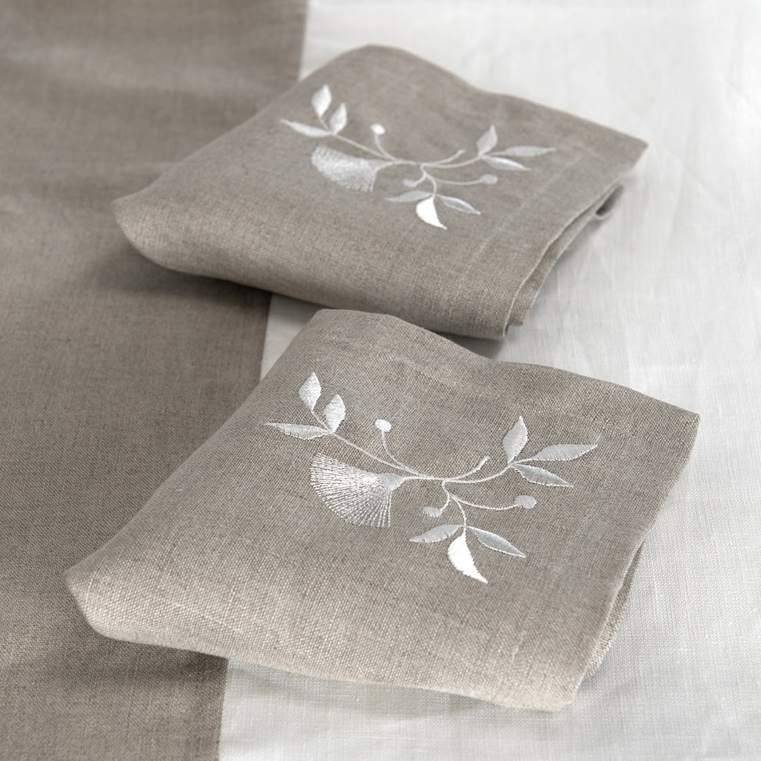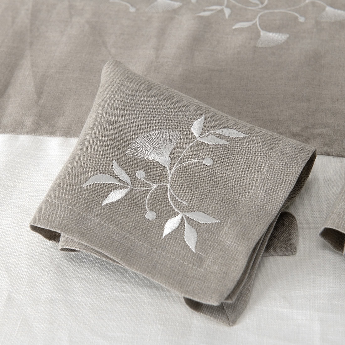 - Detalės: viename servetėlės kampe išsiuvinėta balta gėlytė ir lapeliai
