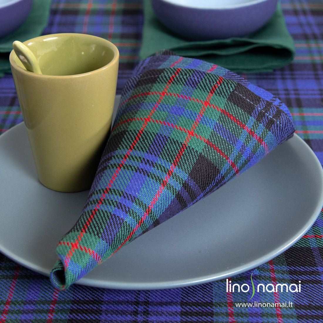 Puslininė servetėlė mėlynais, žaliais langeliais, kuriuos kerta juodos bei skaisčiai raudonos siauros juostelės. Gaminio audinio raštas - įstriži ruoželiai, suteikiantys papildomo margumo. Šaltuoju metų laiku, kai norisi sodrių spalvų, ši servetėlė nuostabiai papuoš šventinį stalą. Galite derinti prie turimų mėlynų, žalių staltiesių ar įsigyti škotiškų langelių staltiesę iš mūsų siūlomos kolekcijos.