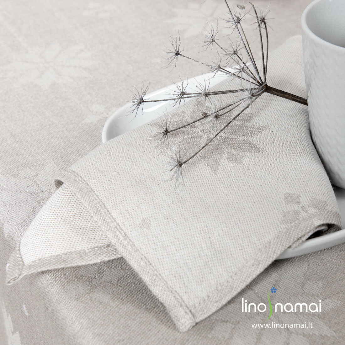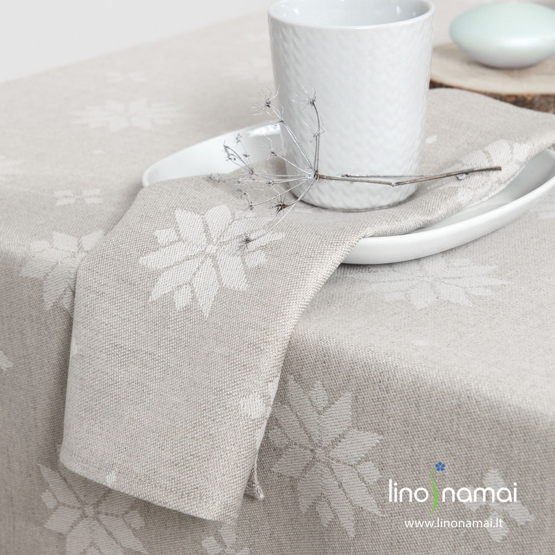 Puslininė šviesiai pilka servetėlė su žvaigždėmis. Gaminio audinį išaudėme iš baltų medvilnės ir nedažytų (rusvai pilkų) lino verpalų. Vienoje servetėlės pusėje vyrauja natūrali pilka lino spalva, kita pusė su dominuojančia balta spalva. Audinys žakardinis, todėl žvaigždžių raštas matomas ant abiejų servetėlės pusių. Prie tokio paties audinio staltiesės dėkite servetėles baltąja puse į viršų, jei norisi gražaus kontrasto. Subtilus šventiškumas nepaliks abejingų Jūsų svečių!