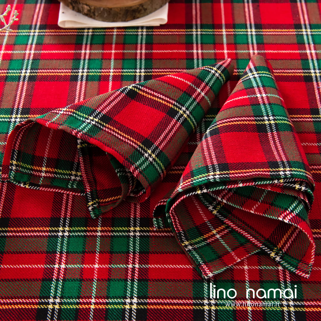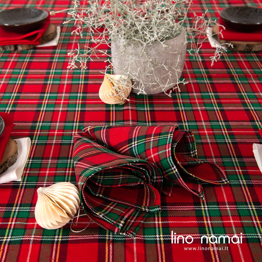 SCARLET languota servetėlė. Jos audinys išaustas lageliais ir įstrižais ruoželiais iš raudonų, žalių lino ir medvilnės verpalų, pagyvintas siaurais geltonais, pieno baltumo (gelsvai baltais) ir juodais dryžiais. Papuoškite šventinį stalą žaismingu kalėdinių spalvų deriniu! Prie šių servetėlių siūlome įsigyti tokio paties audinio staltiesę arba stalo takelį.