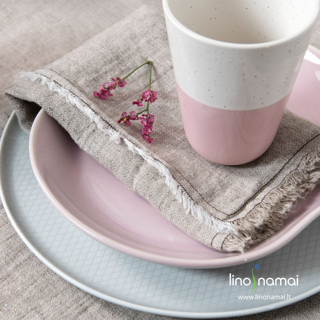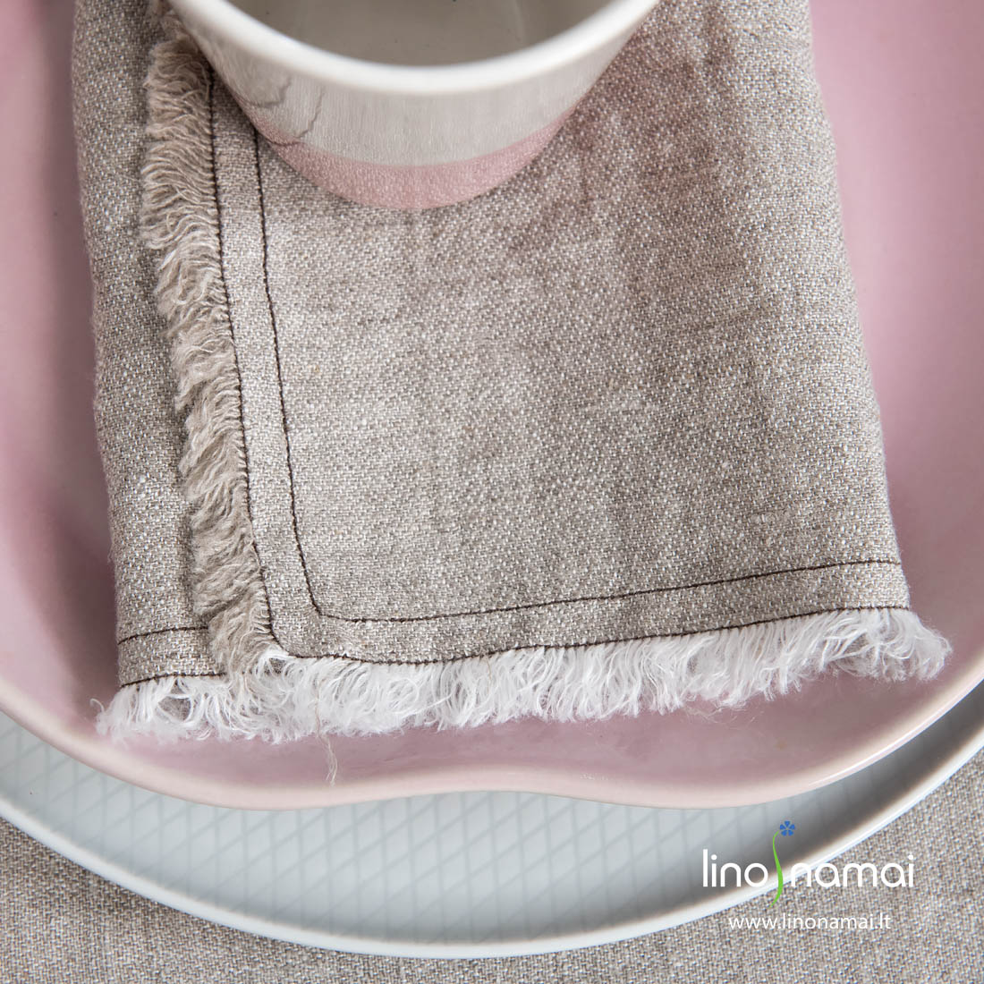 Šviesiai pilka servetėlė su kutais ir rudų siūlų peltakiais visose kraštinėse. Žakardinis gaminio audinys išaustas smulkiu raštu iš natūralios pilkos spalvos (nedažytų) ir baltų lininių verpalų, todėl ir pešioti kutai dvejose kraštinėse balti, dvejose pilkos spalvos. Kad servetėlei suteiktume minkštumo ir švelnumo, išskalbėme ją specialia technologija. Derinkite servetėlę prie pilkos spalvos ar baltų staltiesių.