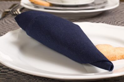 Lygaus audimo servetėlė iš tamsiai mėlyno lino - medvilnės sudėties audinio. Paprastai apsiūta. Galite rinktis iš keturių dydžių ir derinti prie mėlynų atspalvių turinčių staltiesių, dekoruodami savo šventinį stalą.