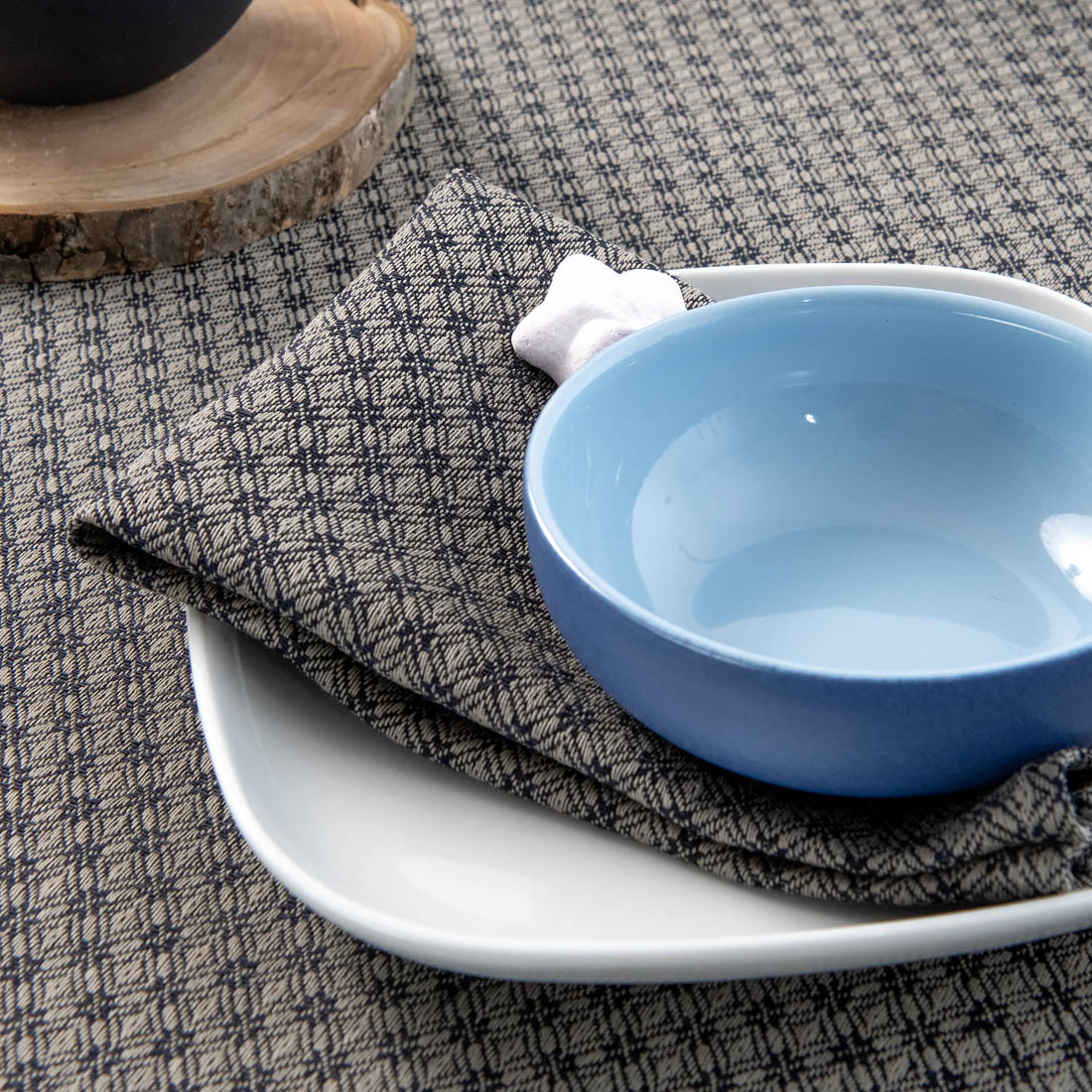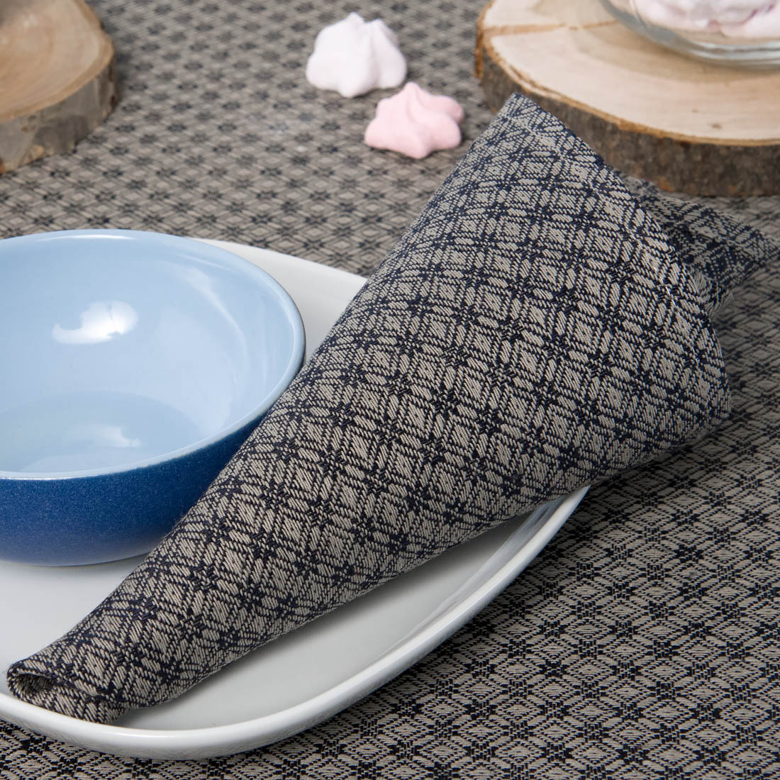 Raštuota servetėlė iš lino ir medvilnės, austa naudojant pilkus ir tamsiai mėlynus (beveik juodus) verpalus. Ypač įdomus raštas - rombeliai, kurių susikirtimo vietose išryškėja gėlytės. Prie šių servetėlių itin derės tokios pat spalvos ir rašto staltiesė.