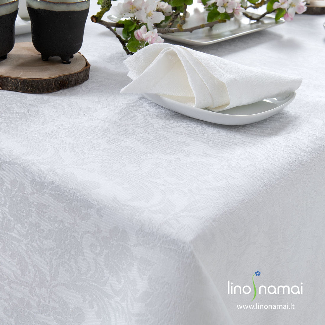 Ryškiai baltos spalvos lino / medvilnės staltiesė, dekoruota įmantriais gėlių motyvų raštais. Puošnūs ornamentai ir švarios spalvos suteiks jūsų kambariui elegancijos bei sukurs gaivos įspūdį. Derinkite su mūsų tokio paties rašto bei spalvos servetėlėmis.