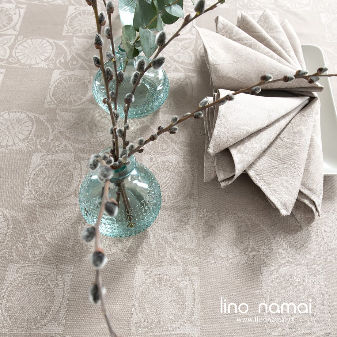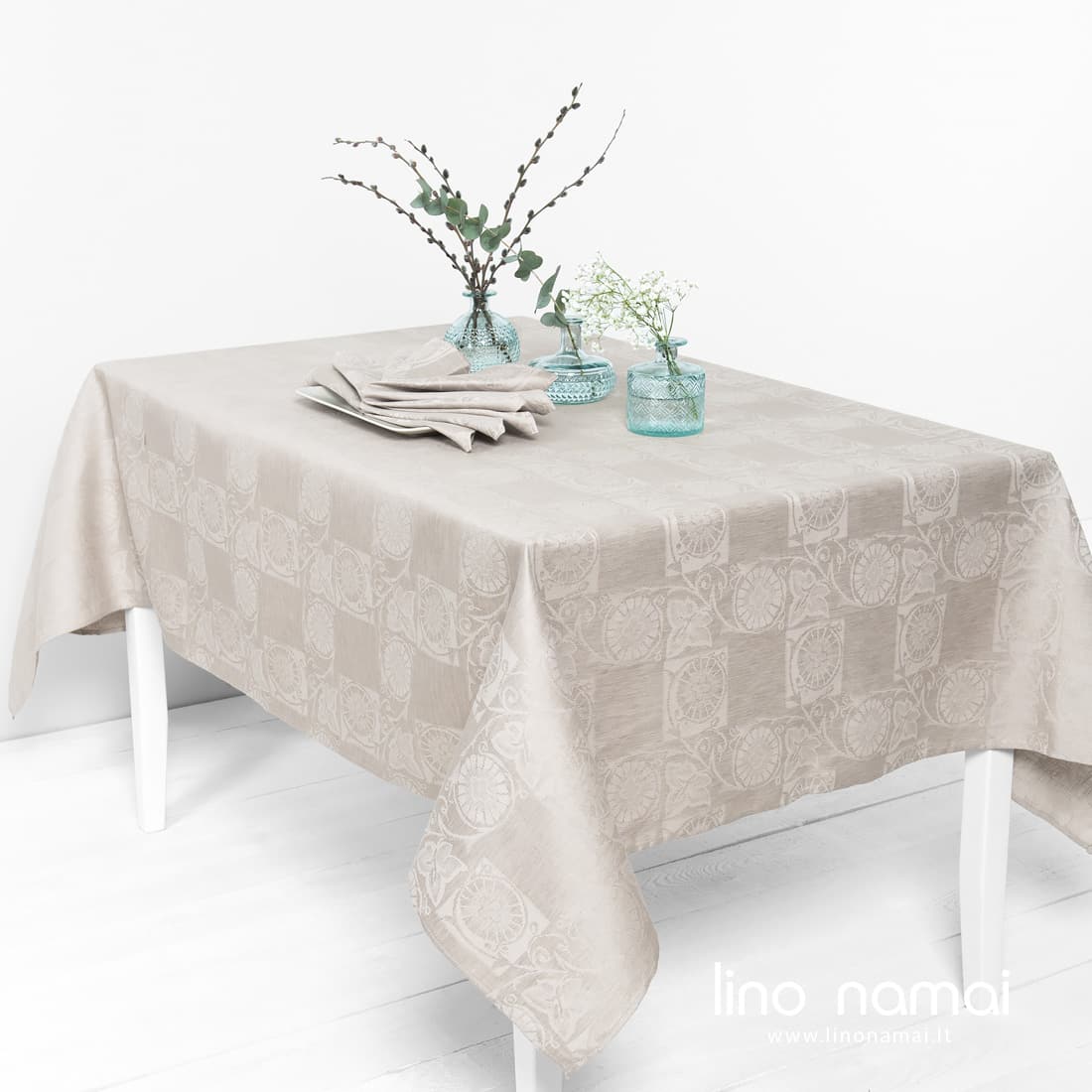 • Žakardinė lino-medvilnės staltiesė augaliniais motyvais, pilkšvai rusva