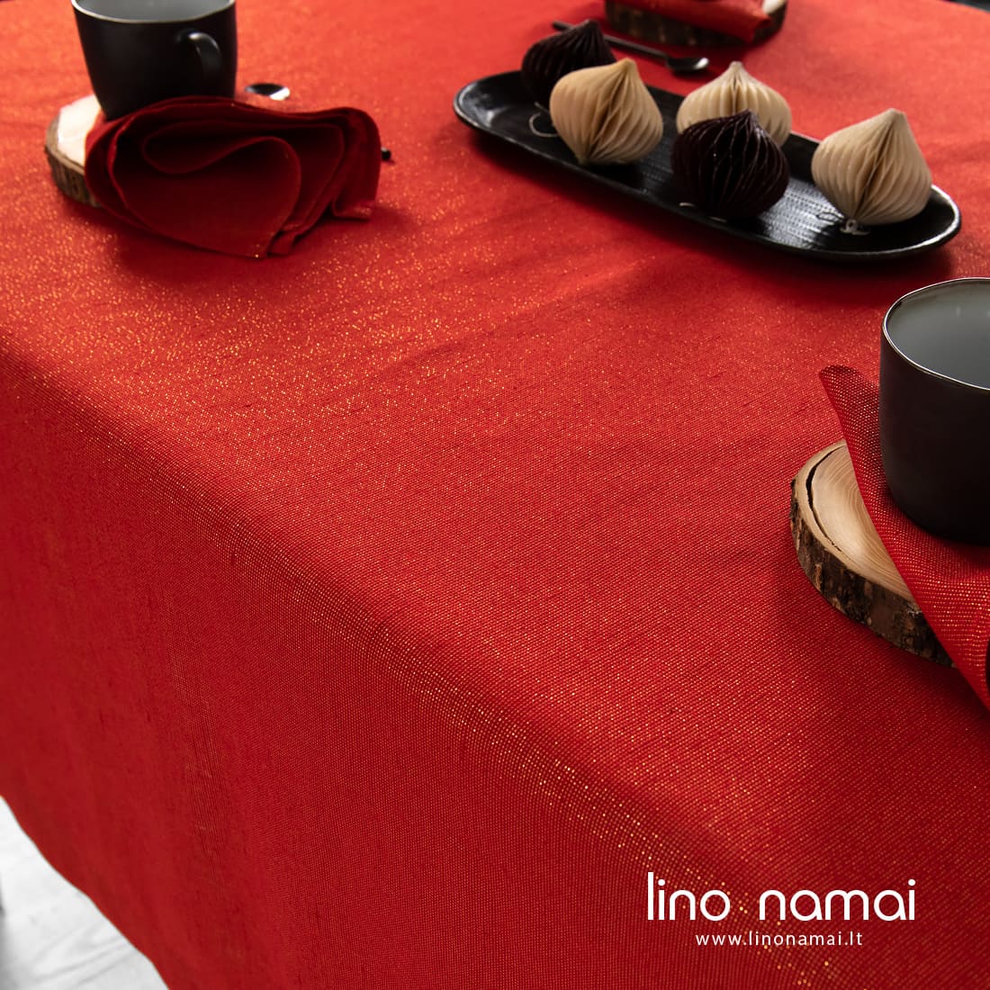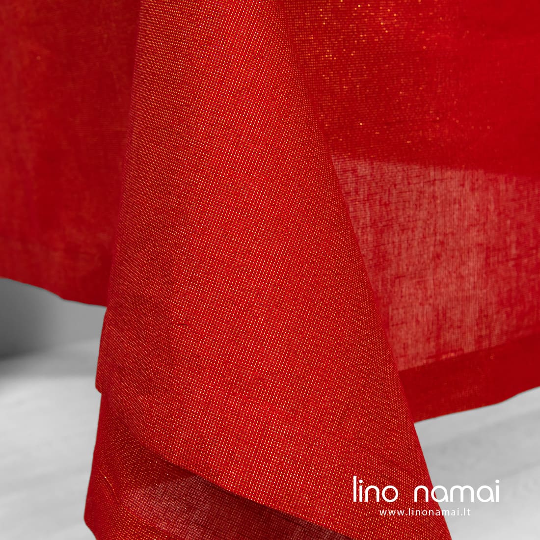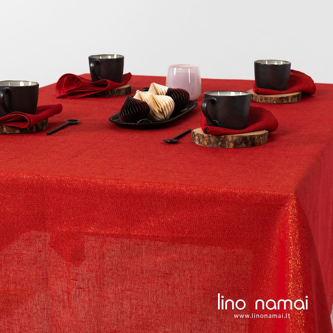 - Lininė raudona staltiesė iš lino-medvilnės-poliesterio sudėties audinio.