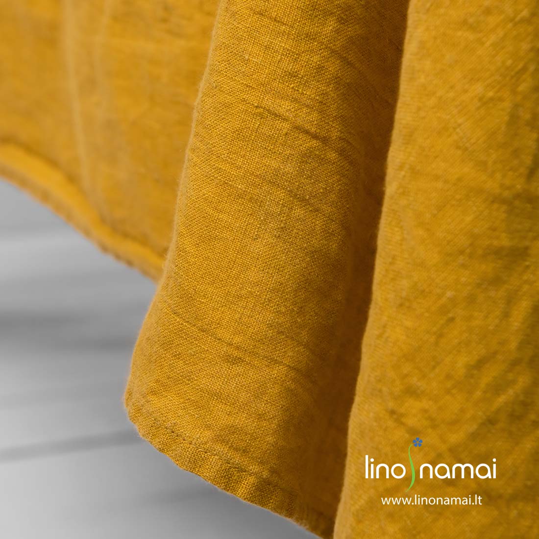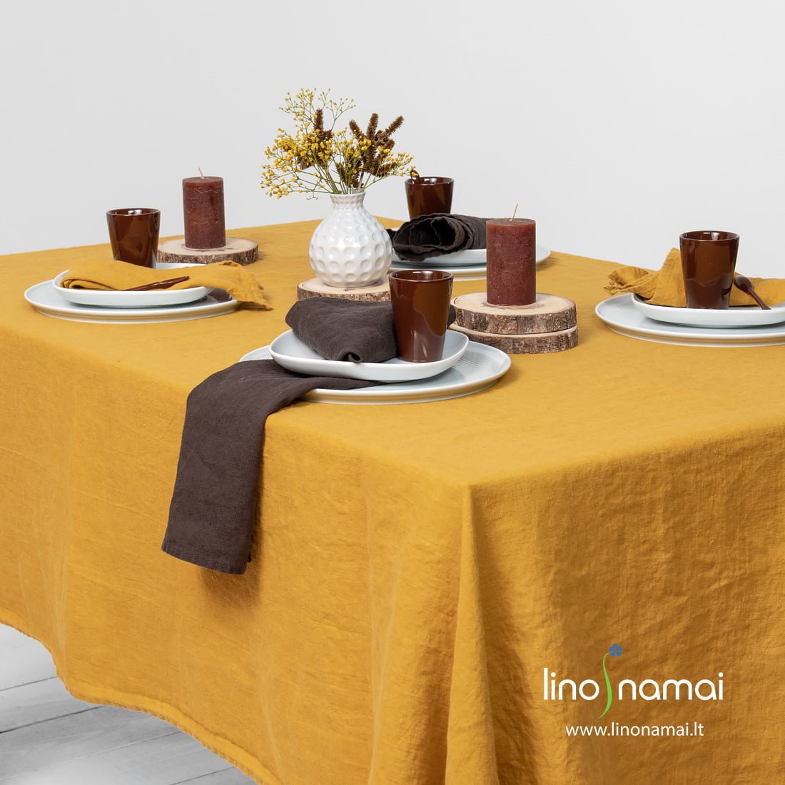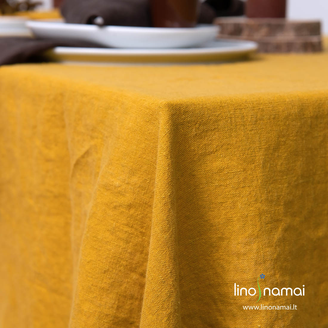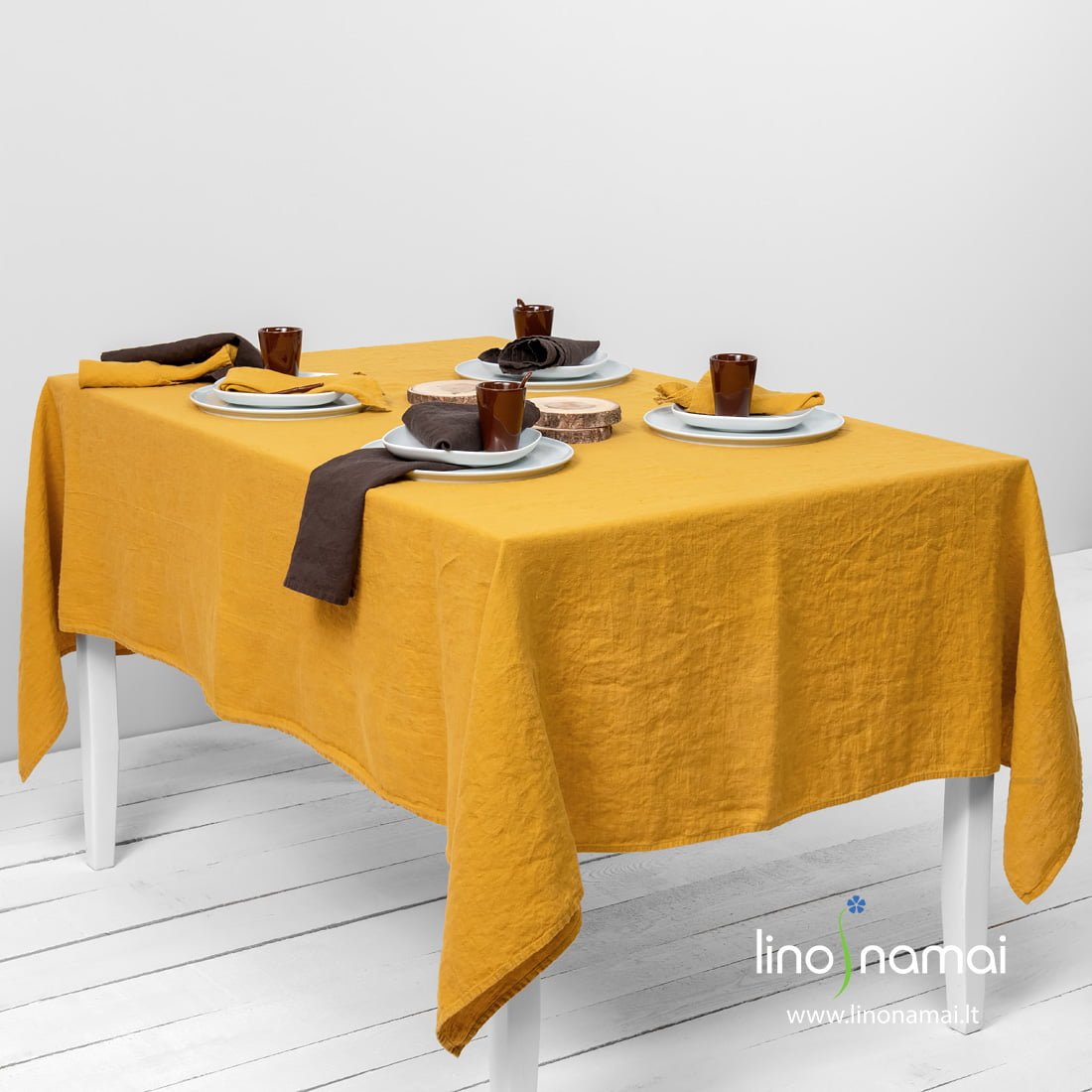Geltona skalbto lino staltiesė. Gaminio audinys turi tamsios oranžinės atspalvį. Ši staltiesė šiek tiek pasiglamžiusi neatsitiktinai: jos audinys skalbtas specialia technologija, minkštas, švelnus, nebesitrauksiantis. Jei Jūsų namams trūksta saulės, įneškite šviesos su šia linine staltiese, sukurkite svečiams jaukią, šiltą atmosferą. Prie staltiesės galima derinti tokio paties ar tamsiai rudo audinio servetėles.