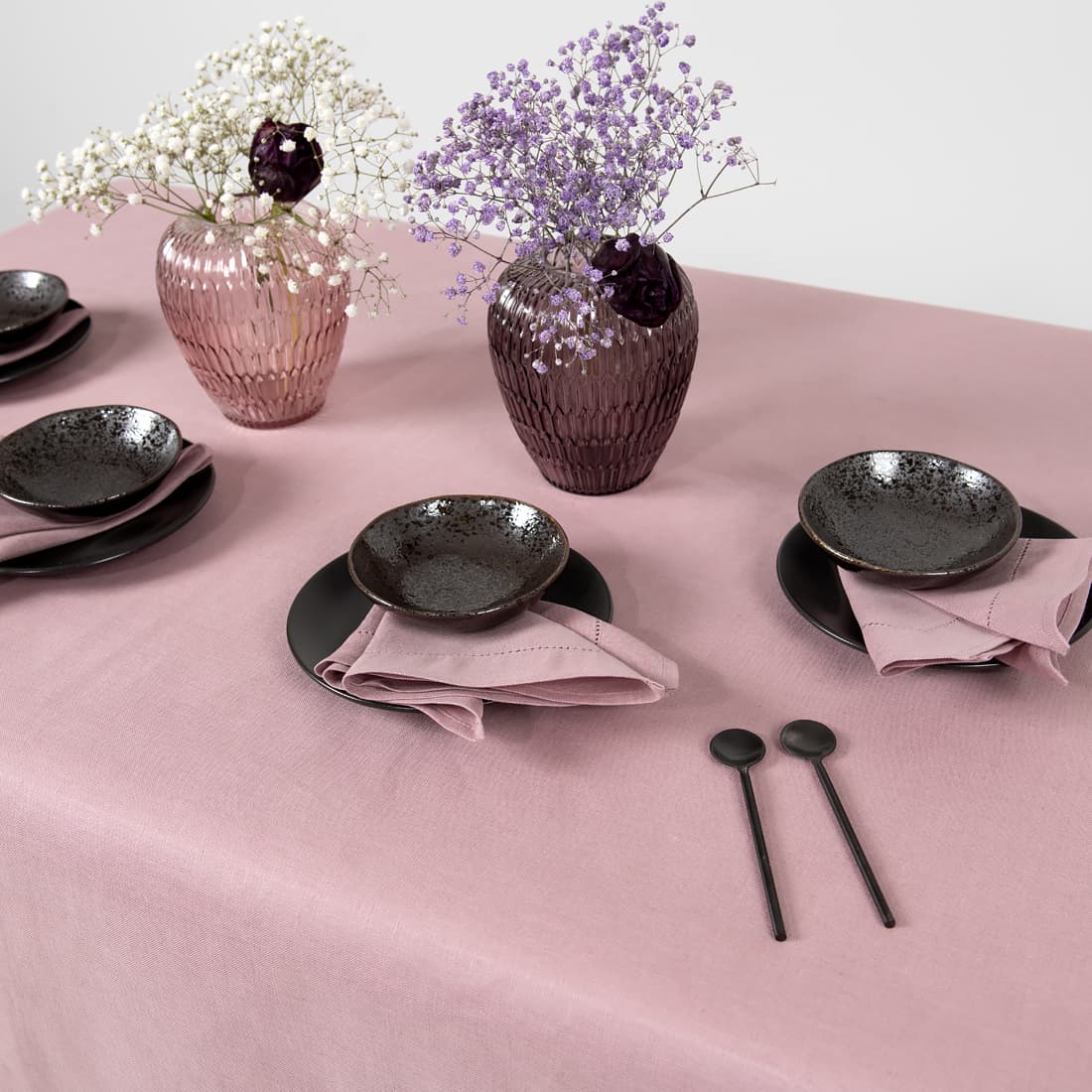 • Lino - medvilnės blyškiai alyvinė mereškuota staltiesė ir derančios servetėlės
