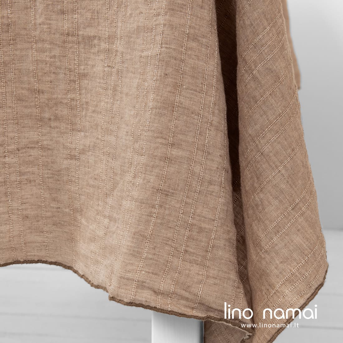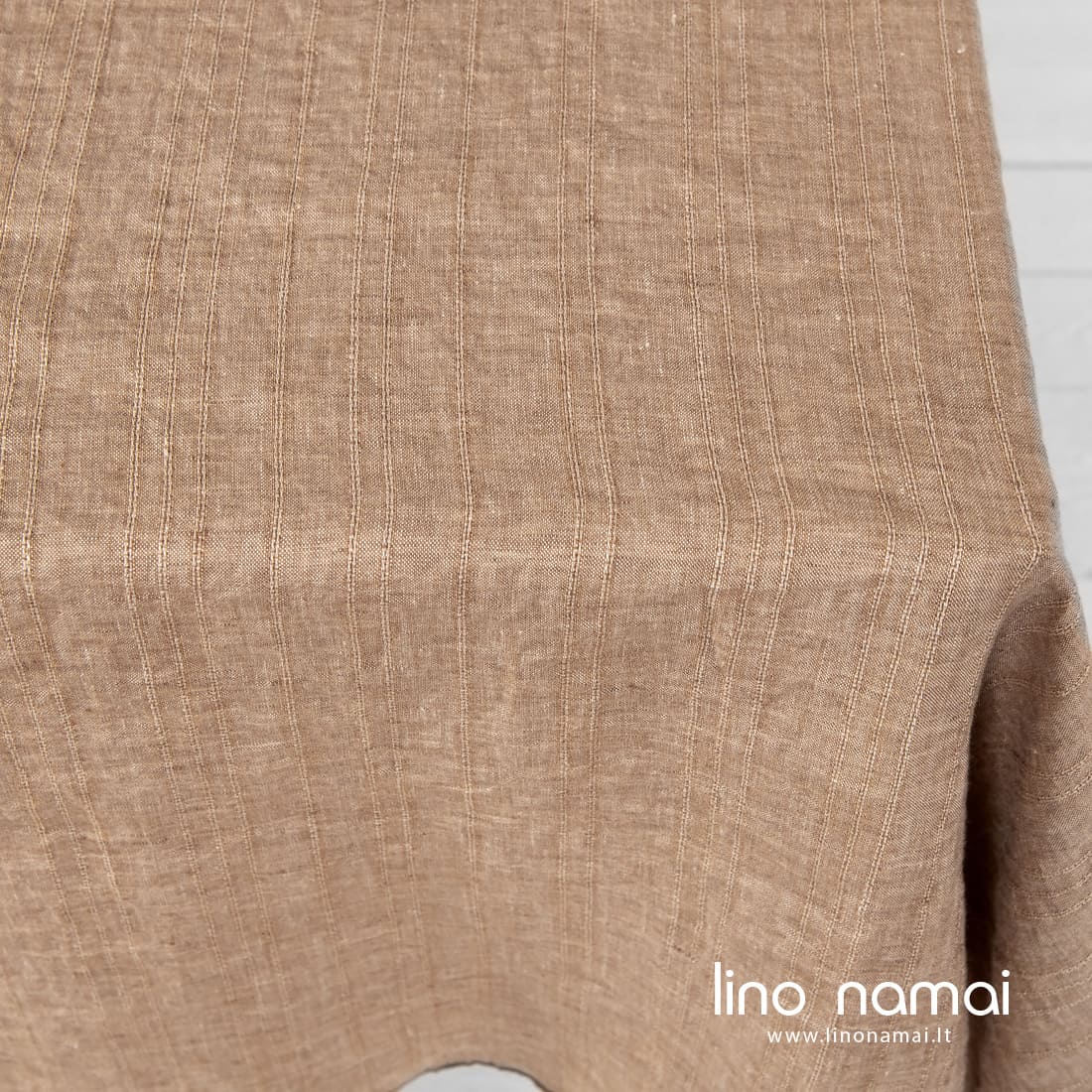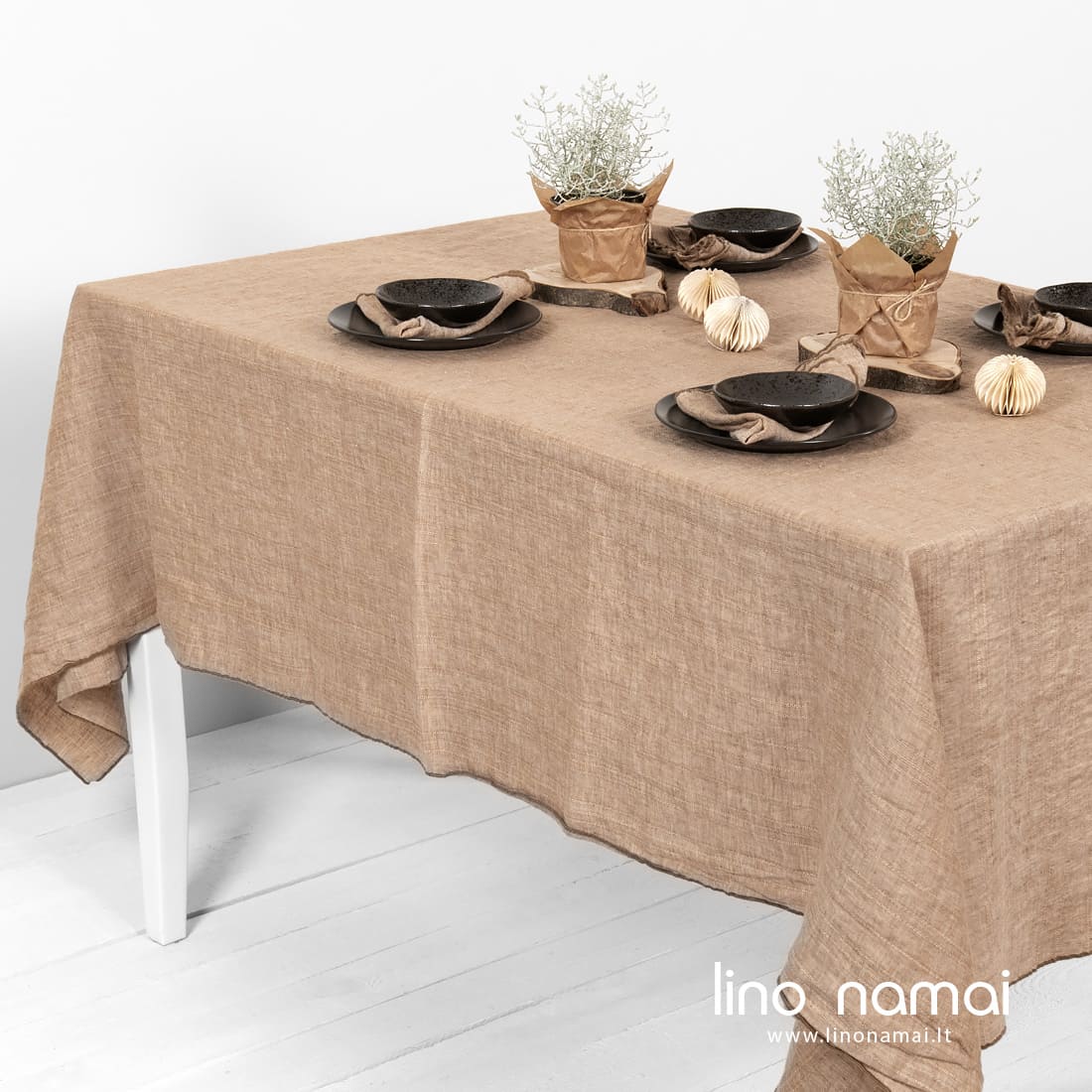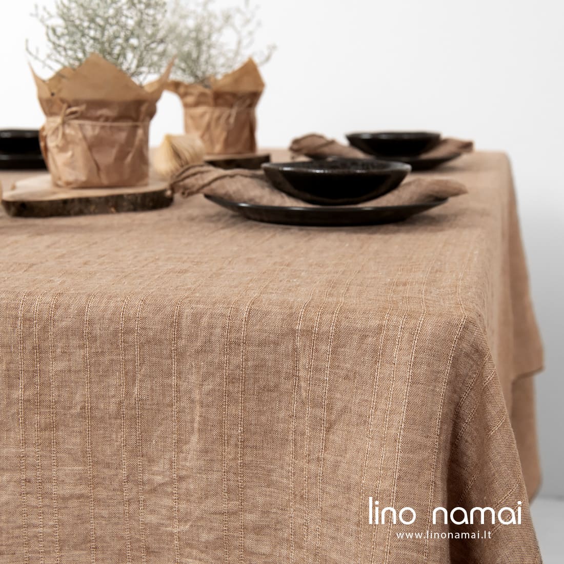 MACADAMIA staltiesė yra melanžinė: jos lino audinys išaustas derinant rudus verpalus su smėlio spalvos (šviesiais gelsvai rusvais) verpalais. Audiniui subtilumo suteikėme įausdami siaurus ažūrinius dryžiukus. Speciali skalbimo technologija suteikė gaminiui nepakartojamo minkštumo, švelnumo ir sumažino traukimąsi. Staltiesės kraštinės apsiūtos tankia dekoratyvine siūle iš tamsesnės spalvos siūlų. Šiltos žemės spalvos stalo gaminiai iš minkšto audinio labai tinka rudens sezonui. Įsigykite ir derančias servetėles jaukiems pasisėdėjimams žvakių šviesoje!
