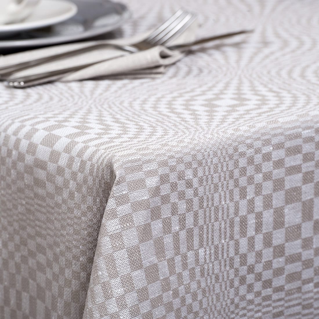 Akį traukiantis geometrinis šios staltiesės raštas išaustas naudojant pilkus medvilnės ir baltus lino verpalus. Ramių spalvų derinys patiks subtilumo gerbėjams, o įmantrus raštas elegantiškai pagyvins šventinio stalo dekorą. Prie šios staltiesės tinka vienspalvės baltos ar pilkos servetėlės ir tokios pačios spalvos indai ir žvakės.