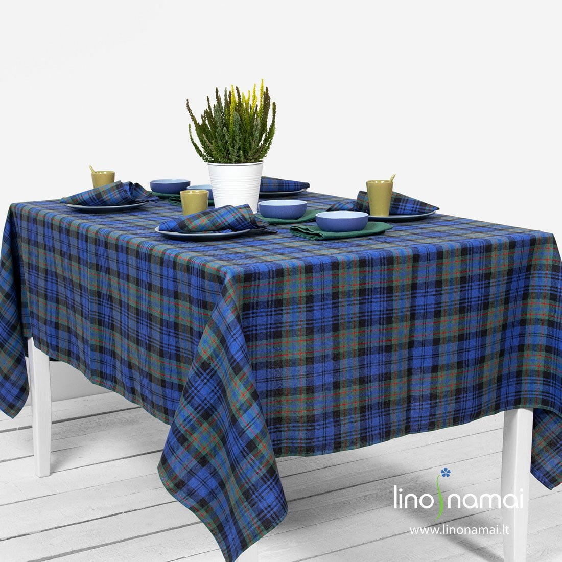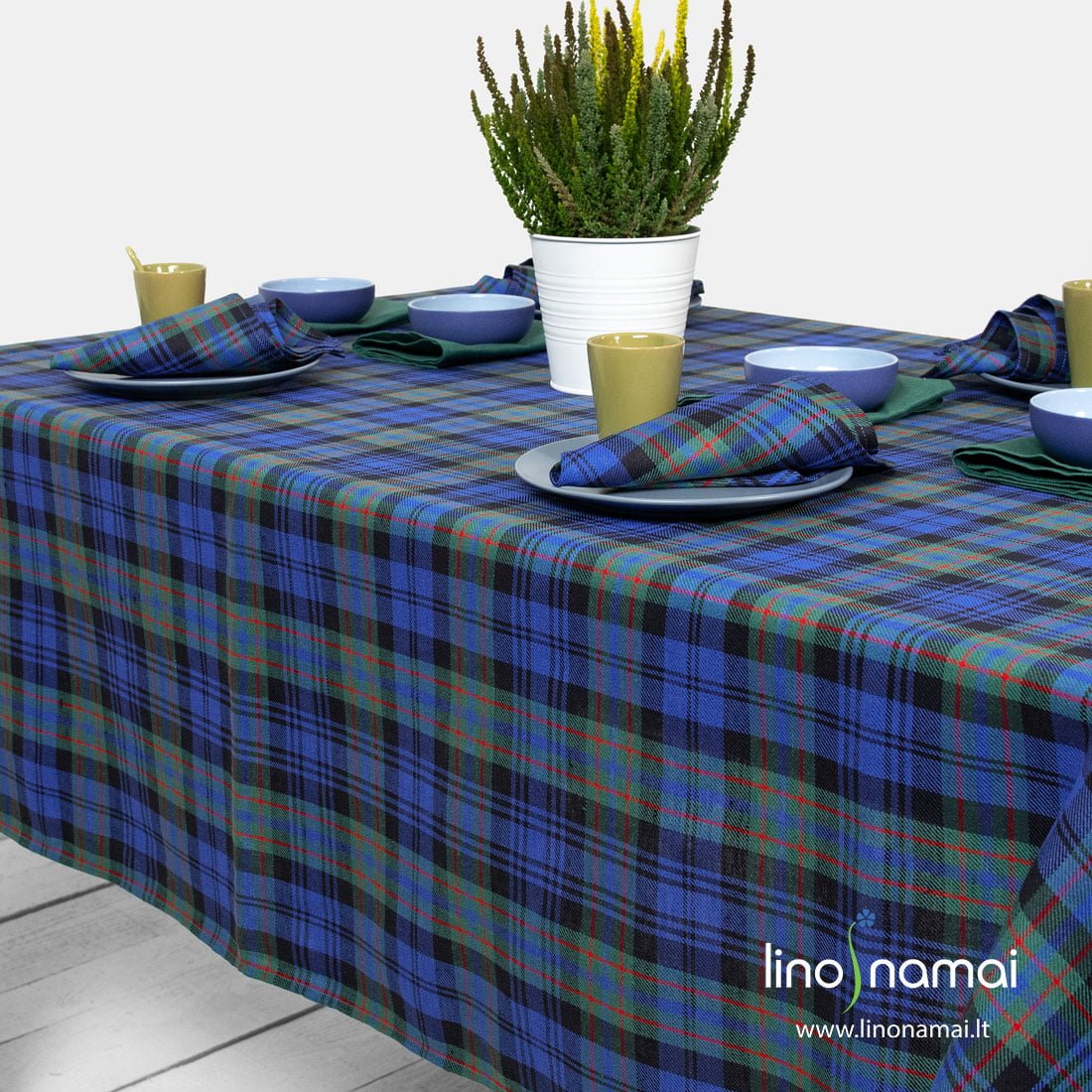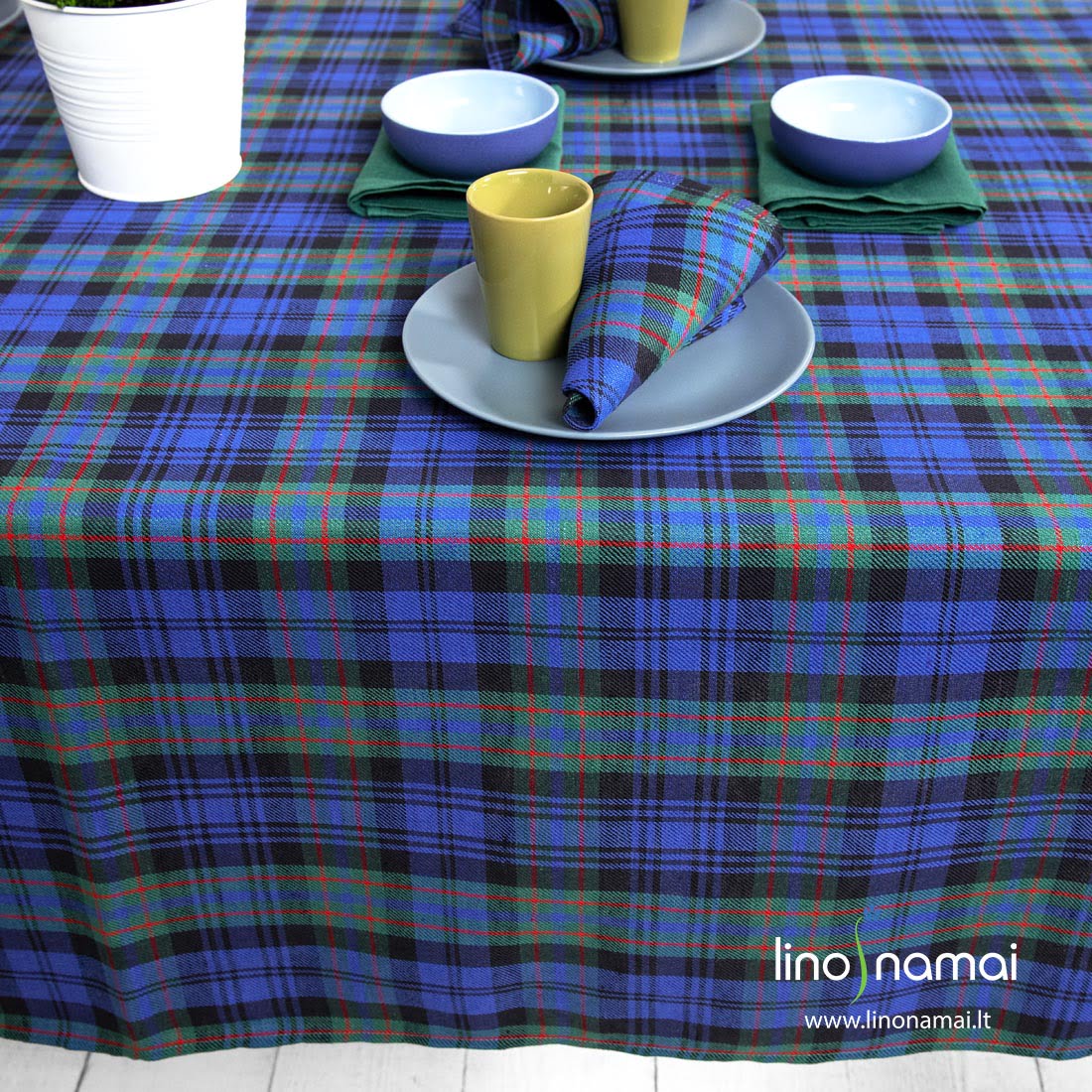 Puslininė staltiesė mėlynais, žaliais langeliais bei juodomis ir siauromis raudonomis linijomis. Lino - medvilnės gaminio audinys austas įstrižais ruoželiais. Šioje kolekcijoje taip pat rasite languotas ir vienspalves žalias servetėles bei stalo takelius. Žiemiškas spalvų derinys, mielas langelių piešinys kvies svečius prie šventinio stalo, kurs jaukią atmosferą. Šiemet papuoškite savo valgomojo stalą škotiškais langeliais!