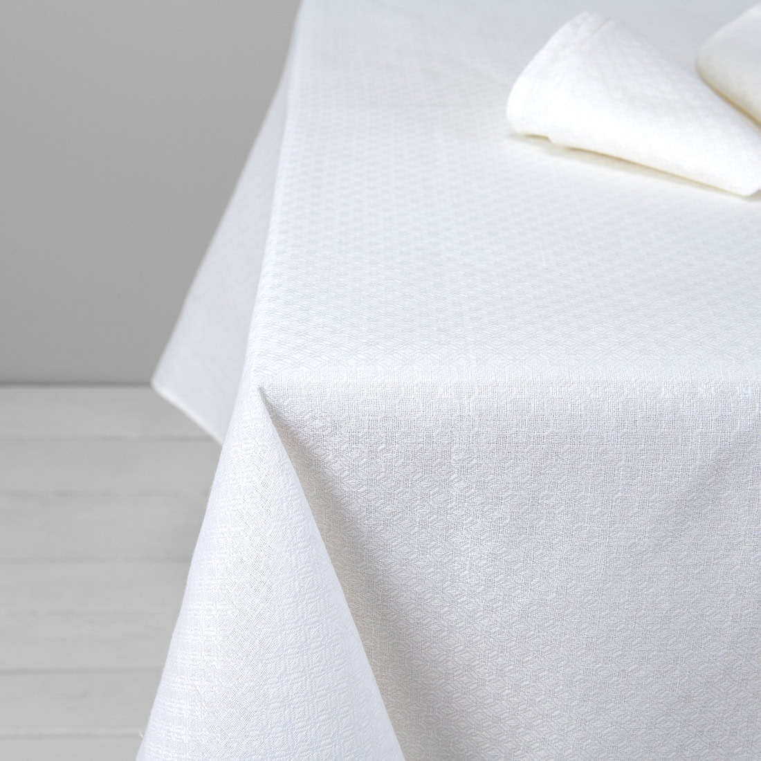 Raštuota ryškiai balta lino / medvilnės staltiesė, austa rombeliais, kurių susikirtimo vietose išryškėja gėlytės. Ši balta staltiesė suteikia nepriekaištingos švaros ir šviesos įspūdį. Puikiai tiks patiesti tiek pietų stalui, tiek iškilmingoms progoms. Prie šios puslininės staltiesės puikiai derės tokio paties rašto bei spalvos servetėlės.