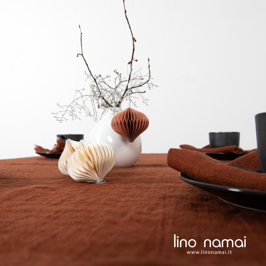 ROY ruda staltiesė. Šio gaminio 100% lino audinys yra melanžinis, t.y. išaustas iš dviejų spalvų (tamsiai rudų ir raudonai rudų) verpalų. Kad audinys būtų minkštas, švelnus ir malonus liesti, jį išskalbėme specialia technologija. Tokio audinio staltiesės nereikia lyginti - palikite purią, nerūpestingai pasiglamžiusią paviršiaus struktūrą. Kraštines papuošėme pešiotais 1,5cm ilgio kutais. Sodri šilta spalva labai tinka rudens sezonui, tačiau jei mėgstate rudus atspalvius, šia linine staltiese ir derančiomis servetėlėmis valgomojo stalą galite puošti visus metus!