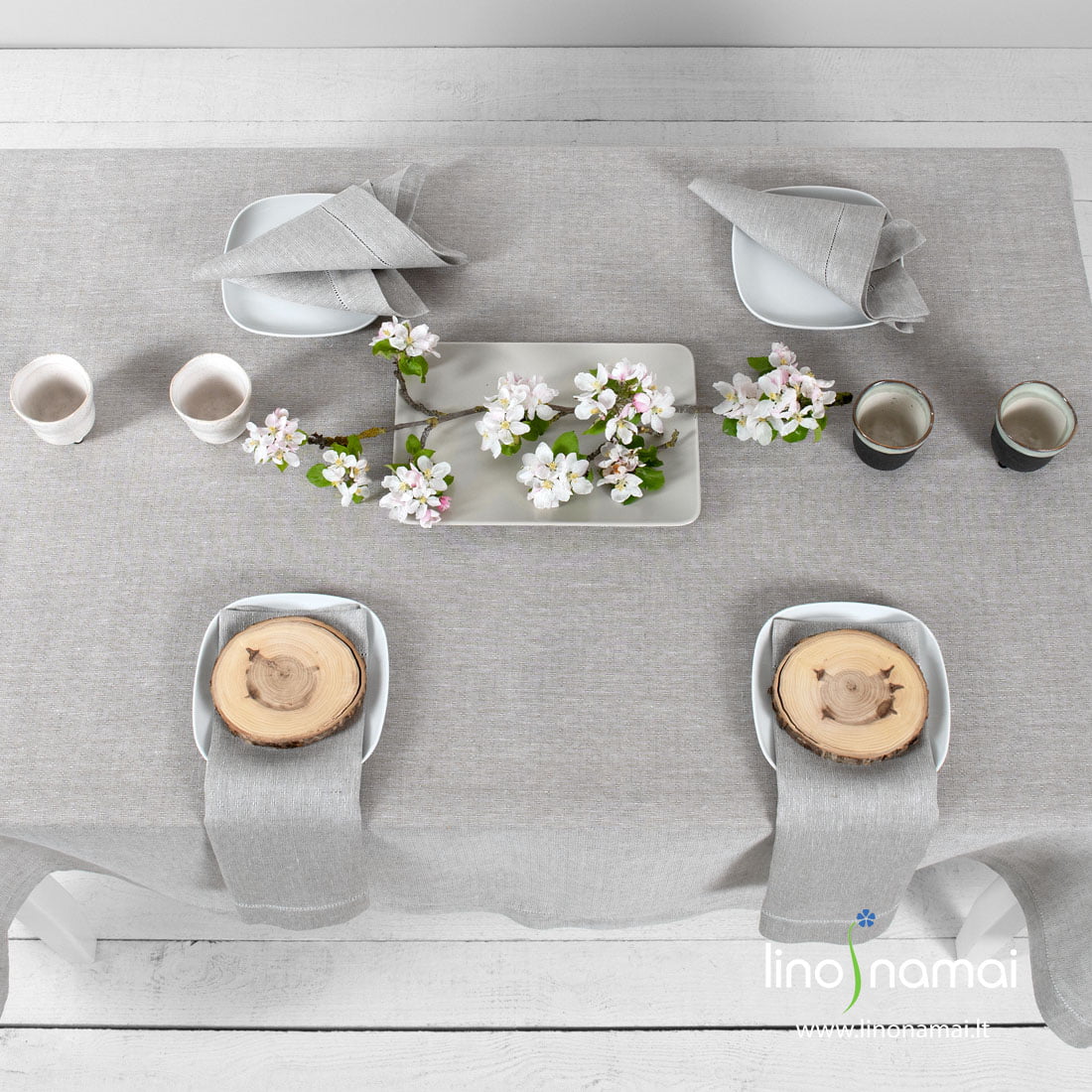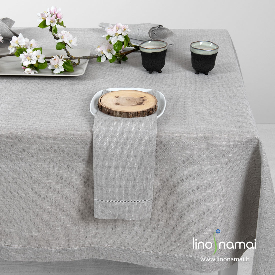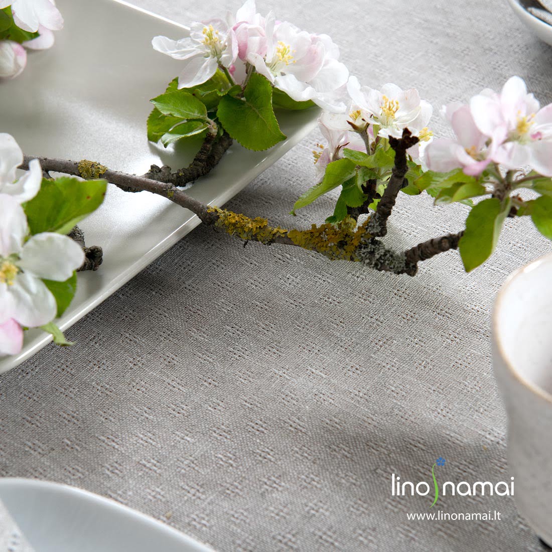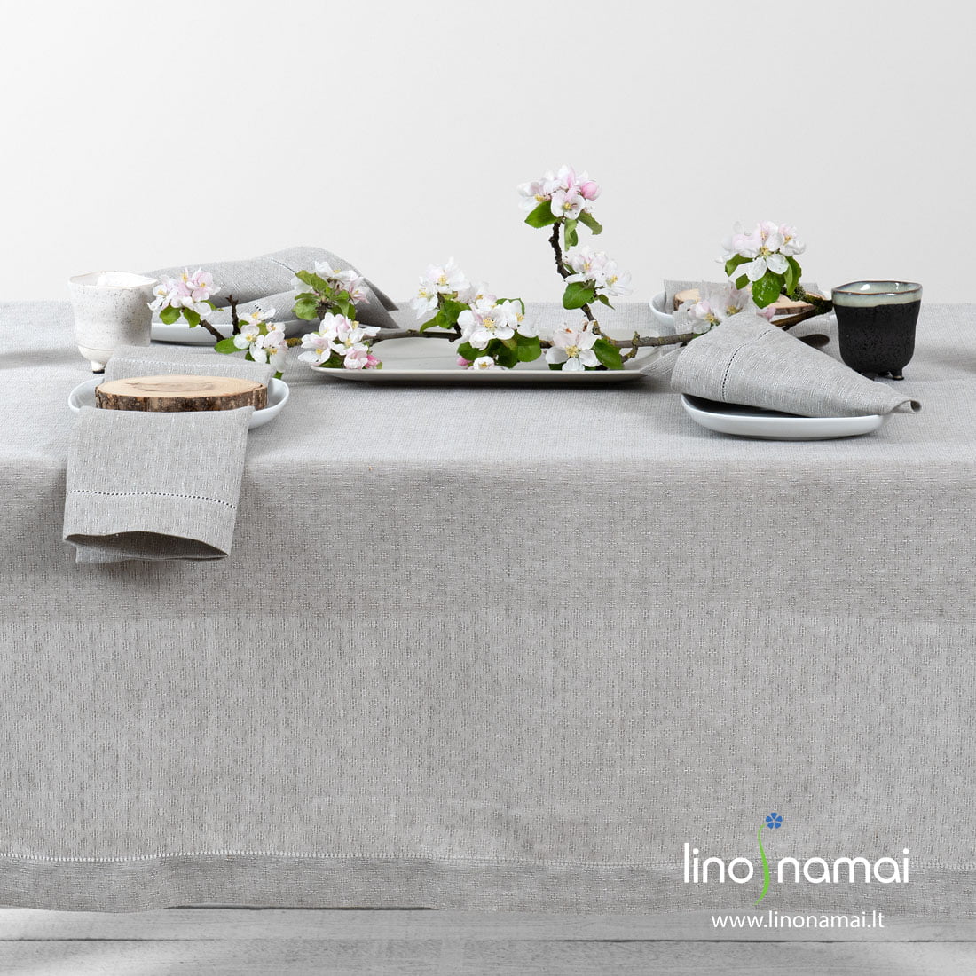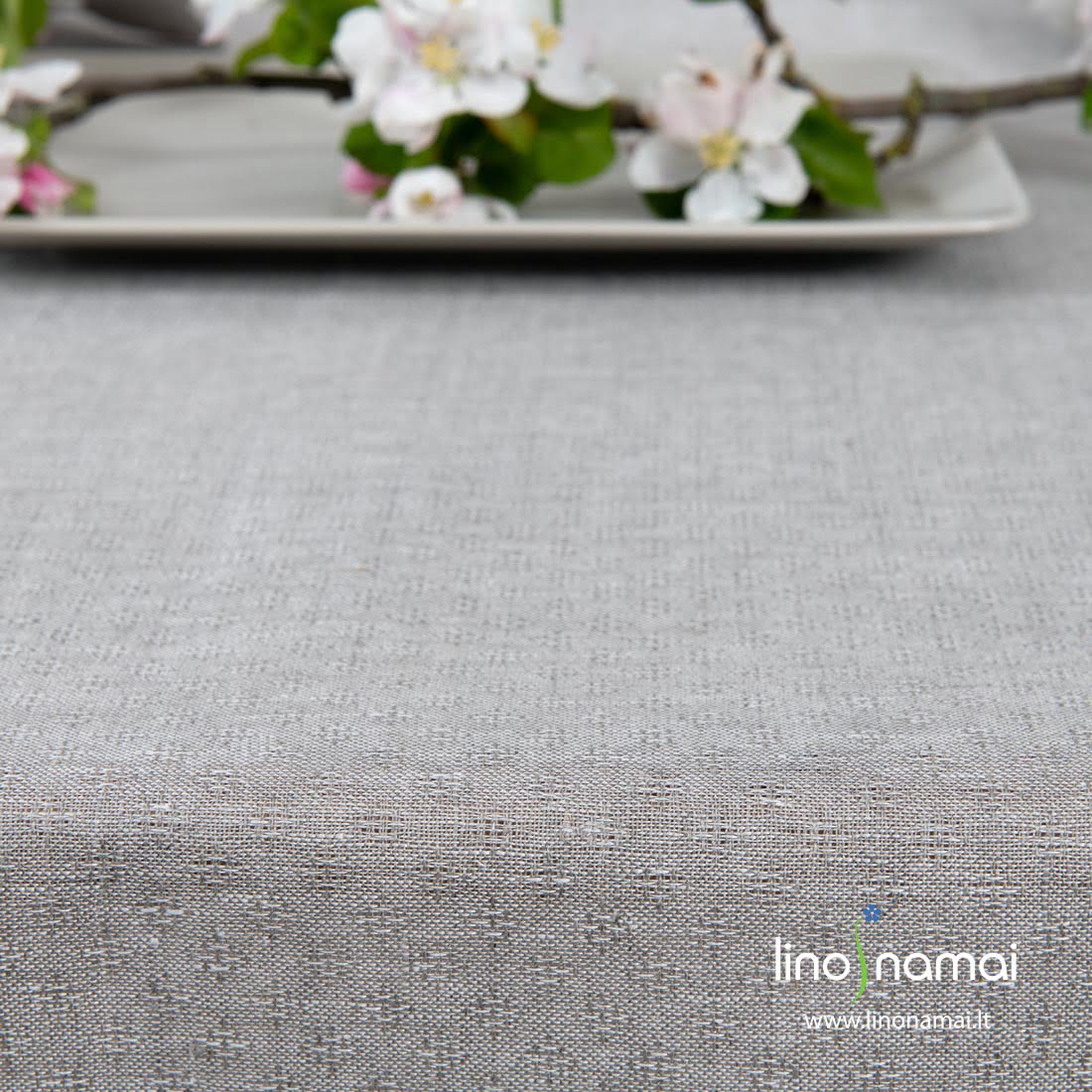 Šviesiai pilkos spalvos staltiesė, pagaminta iš lengvo, kiauraraščio langeliais dekoruoto gryno lino audinio, austo iš baltų ir natūralios spalvos (nedažytų, rusvai pilkų) verpalų. Staltiesės kraštai dailiai puošti viena mereškuota eilute. Ramios spalvos ir smulkūs raštai - ši staltiesė pasitarnaus jums tiek kasdienybėje, tiek švenčių proga. Derinkite su mūsų tokio paties dizaino šviesiai pilkomis servetėlėmis.