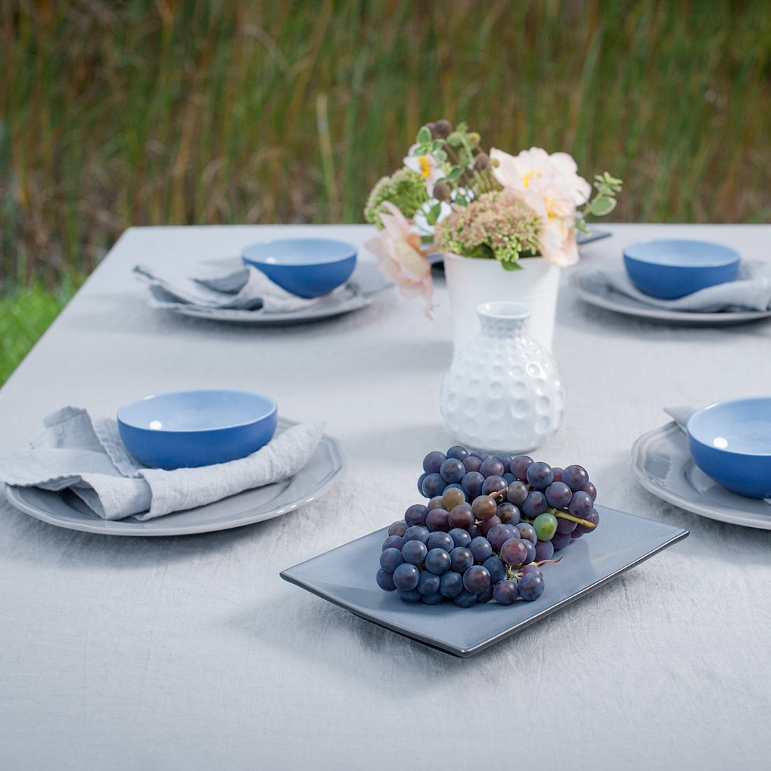 Lininė staltiesė iš šviesiai pilko su vos juntamu melsvu atspalviu audinio. Lininis audinys prieš siuvimą specialiai skalbtas, todėl ši staltiesė minkšta, švelni, truputį glamžyta. Tai išskirtinis tokių stalo gaminių bruožas. Ir jų nereikia lyginti. Prie šios staltiesės rinkitės tokio paties skalbto audinio servetėles.