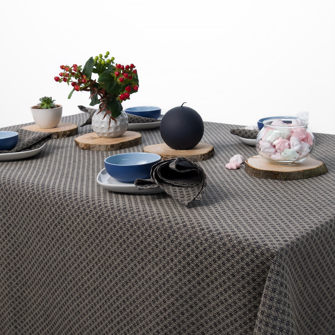 Raštuota lino / medvilnės staltiesė, austa tamsiai mėlynais ir pilkais rombeliais, kurių susikirtimo vietose išryškėja gėlytės. Pilkai melsva staltiesė bus originalus stalo akcentas ir puikus šventinis puošybos elementas. Prie šios puslininės staltiesės puikiai derės tokio paties rašto bei spalvos servetėlės.