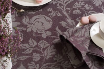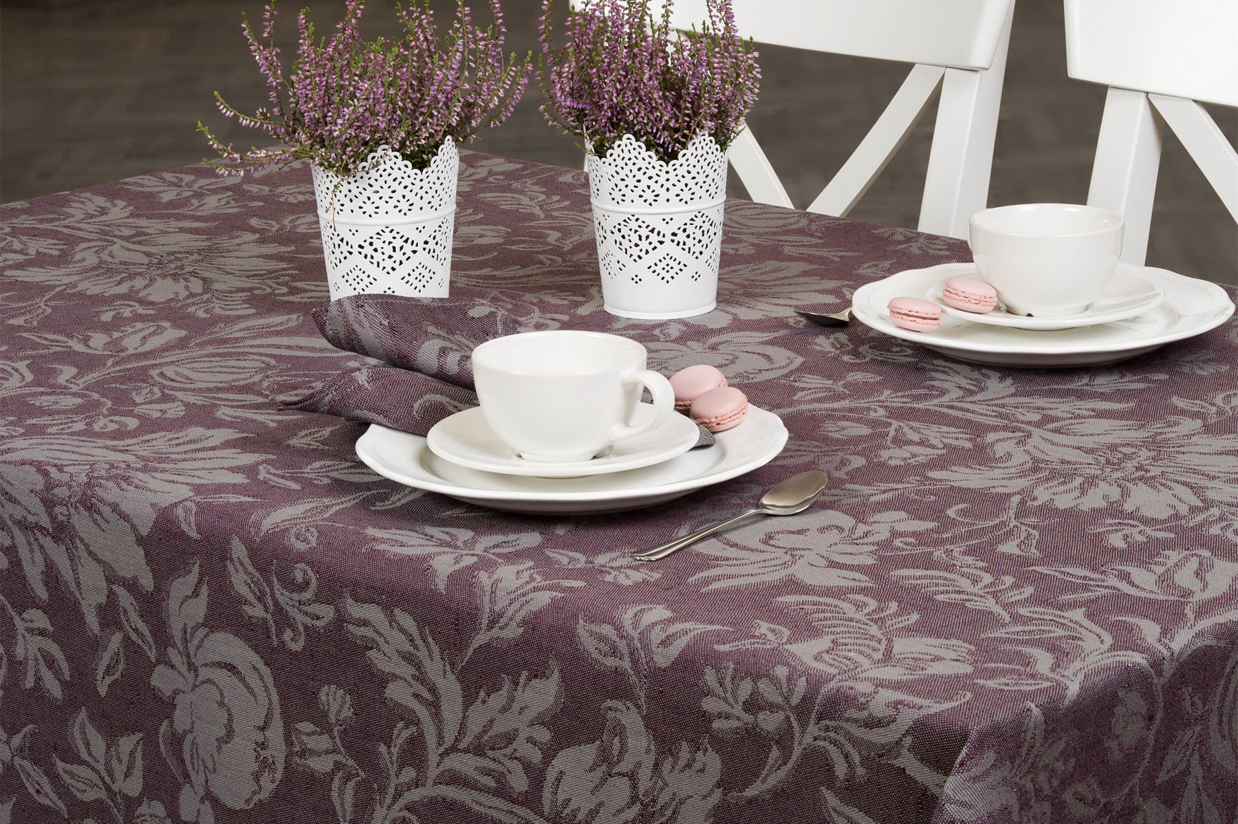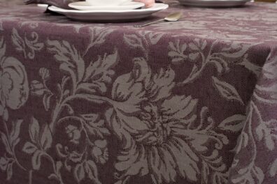 Žakardinis šios lino - medvilnės staltiesės audinys išaustas iš tamsiai violetinių ir pilkų verpalų. Sudėtingi, prabangūs pilki gėlių raštai violetiniame fone puikiai tiks pačioms gražiausioms Jūsų šeimos šventėms. Siūlome priderinti tokio paties audinio ar vienspalves pilkas servetėles.