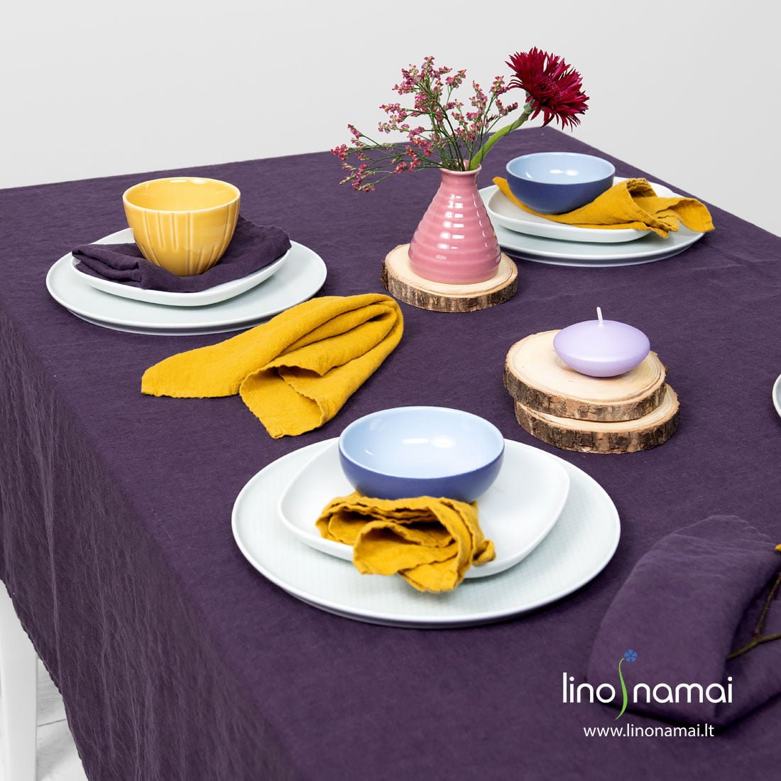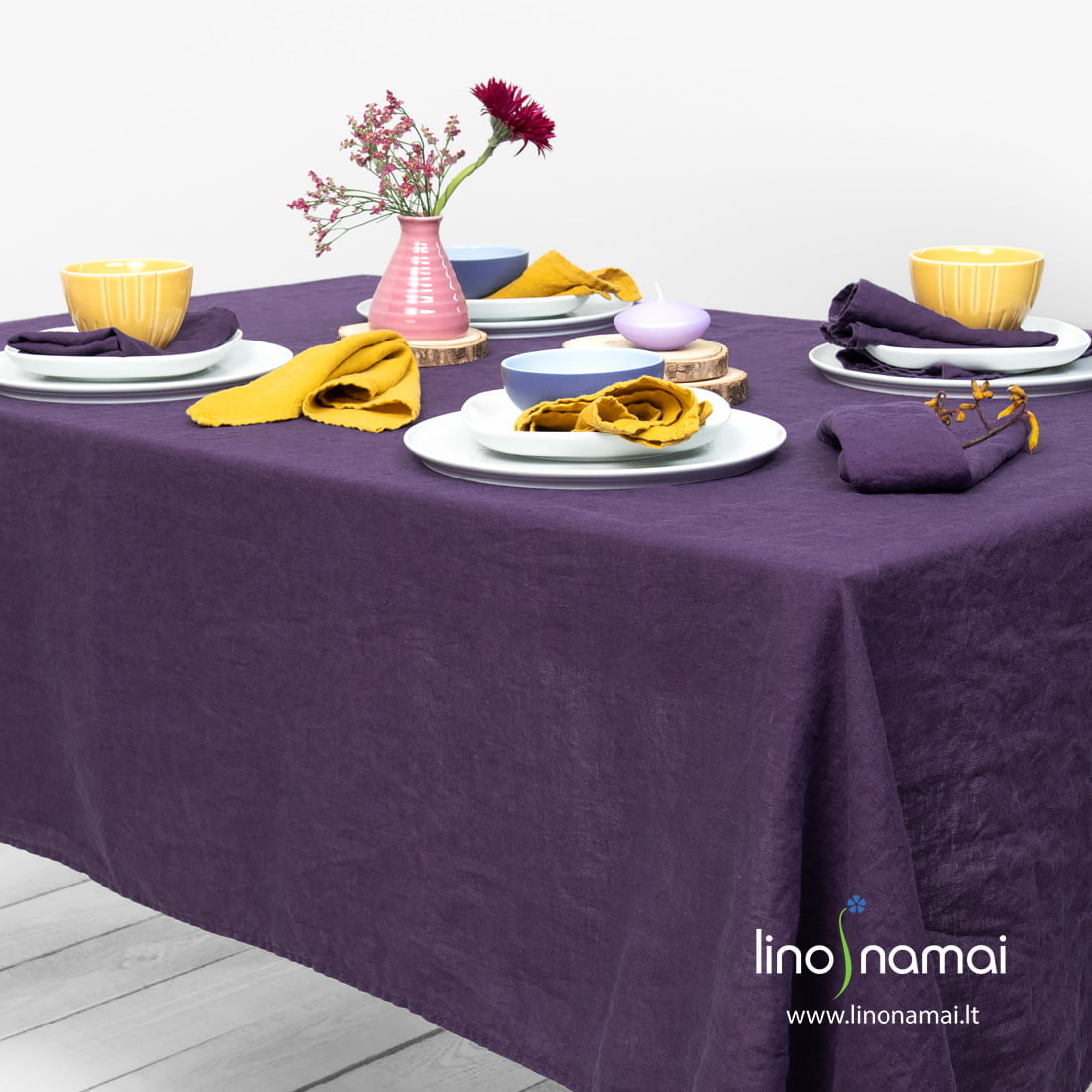Violetinė skalbto lino staltiesė. Karališka sodri spalva atneš prabangaus solidumo į Jūsų namus, o skalbtas minkštas kilniai pasiglamžęs 100% lino audinys sušvelnins atmosferą, sukurs jaukią aplinką. Rekomenduojame derinti su violetinėmis arba, kuriant gražų kontrastą, su geltonomis servetėlėmis. Tačiau neribokite savo vaizduotės! Tikime, kad galite kūrybiškai priderinti ir kitokių atspalvių servetėles, kitus dekoro elementus, gėles, indus. Įsigykite šią staltiesę, atraskite spalvų ir atspalvių pasaulį!