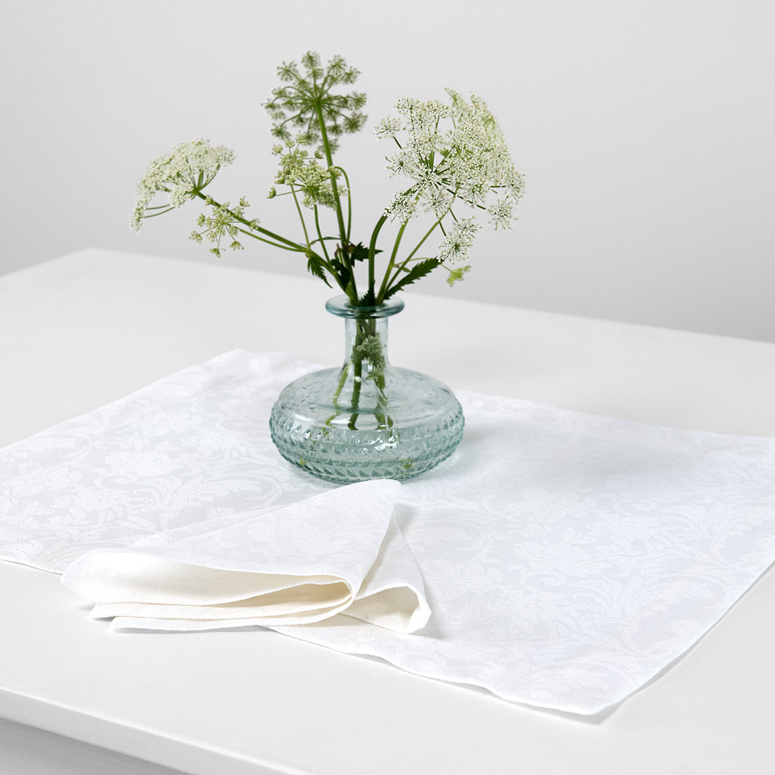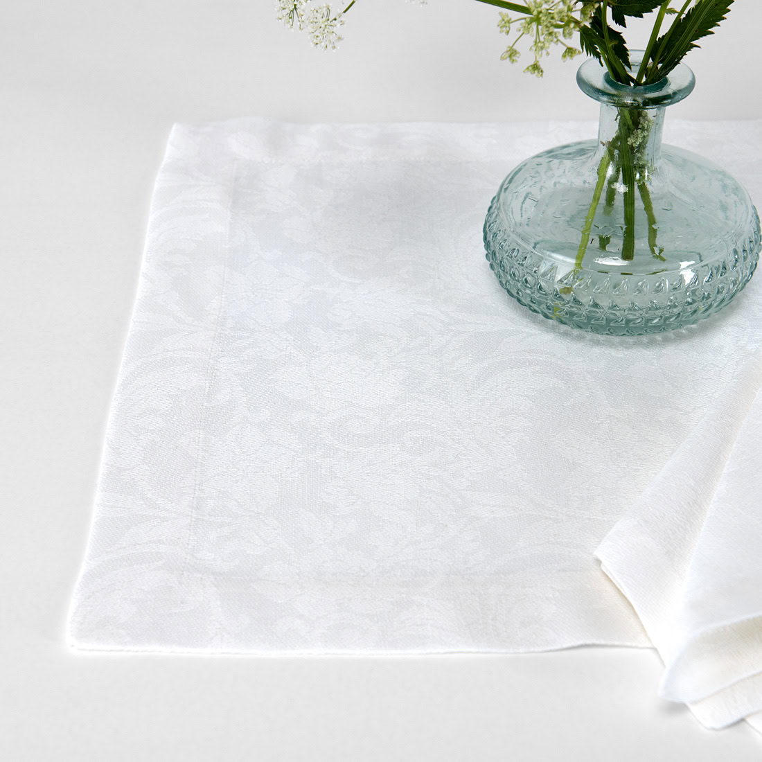 Ryškiai baltos spalvos žakardinis lino / medvilnės stalo patiesaliukas, pasiūtas iš itin elegantiško, gelių ornamentais marginto audinio. Papuoškite savo stalą šiuo puikiu patiesaliuku. Neabejotinai sukursite savo namams jaukią ir pavasariškai šiltą atmosferą.