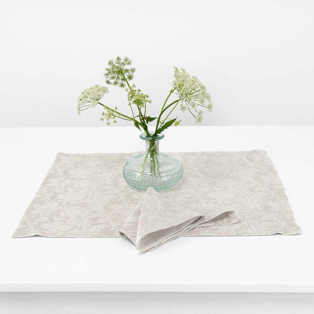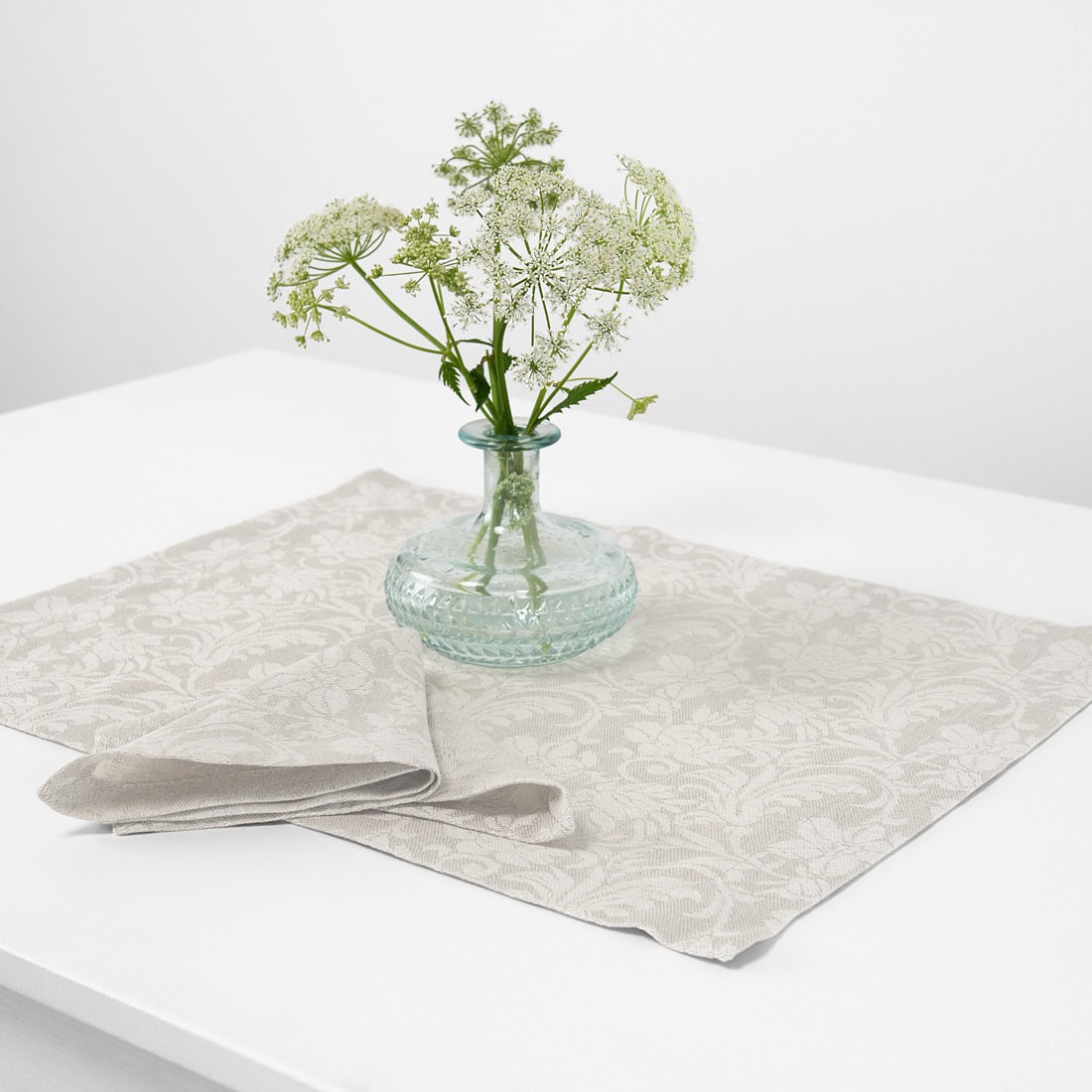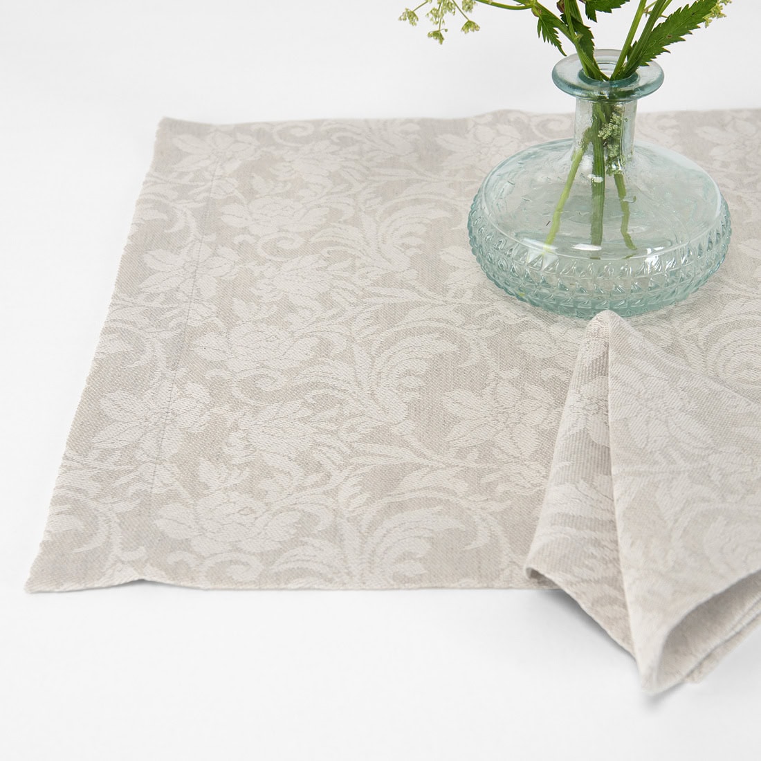 Šviesiai pilkas lino / medvilnės stalo patiesaliukas su tamsesnės pilkos spalvos gėlių ornamentais. Ši madinga ir elegantiška dekoracija ypatingai puoš jūsų stalą. Taip pat turime tokios pat spalvos ir rašto servetėlių. Suderinkite juos kartu ir be abejonės sukursite jaukią aplinką ne tik artimiesiems, bet ir svečiams.