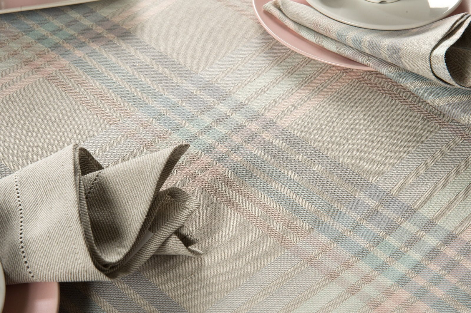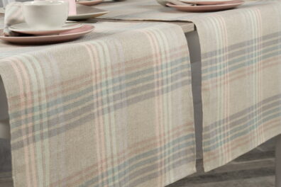 Šviesiai pilkos spalvos (austas iš baltų ir natūralios pilkos spalvos, nedažytų verpalų) lino - medvilnės stalo takelis pagyvintas įvairiaspalviais dryžiais, kurie susikirsdami sudaro didelius langelius. Juostelės austos įstrižais ruoželiais iš melsvai pilkšvų, žalsvų ir rausvų verpalų. Pastelinėmis spalvomis puoštas pilkas takelis tiks ir kasdienai, ir švenčių proga, jei derinsite su tokio paties audinio ar vienspalvėmis šviesiai pilkomis servetėlėmis.