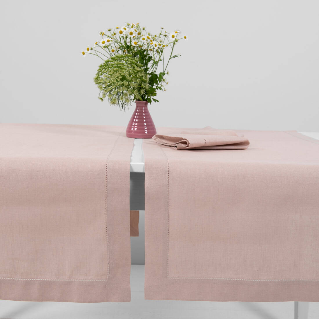 • LUNA lino-medvilnės takelis šviesiai rožinis su 4cm pločio kraštinių palenkimu