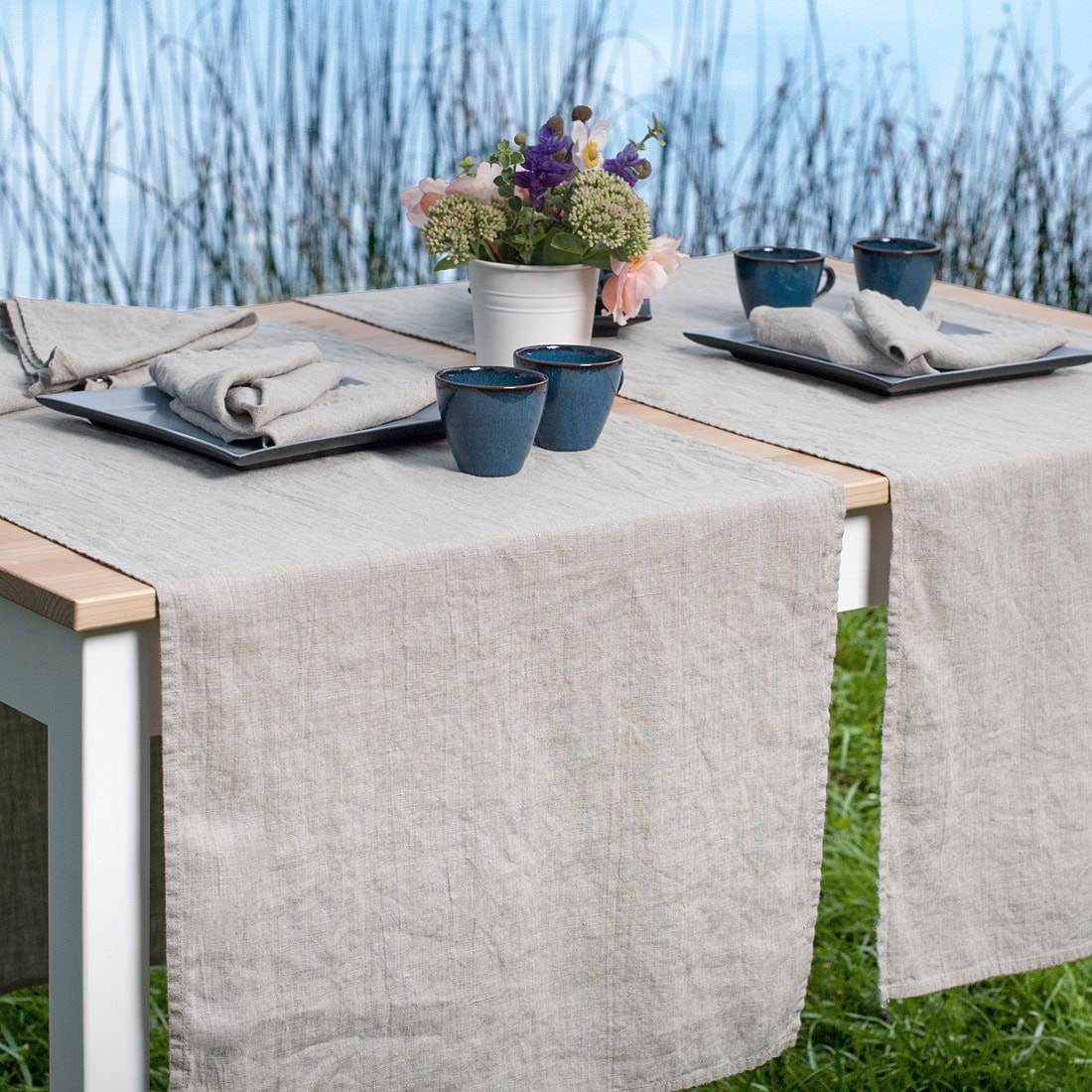 Šiam lininiui takeliui pasiūti naudojome natūralios rusvai pilkos spalvos audinį, austą iš nedažytų verpalų. Audinys prieš siuvimą skalbtas specialiu būdu, todėl gaminys ypač minkštas, įgavęs glamžytą struktūrą. Net nereikia lyginti - tieskite ant stalo ir kvieskite draugus papietauti ar pavakarieniauti.