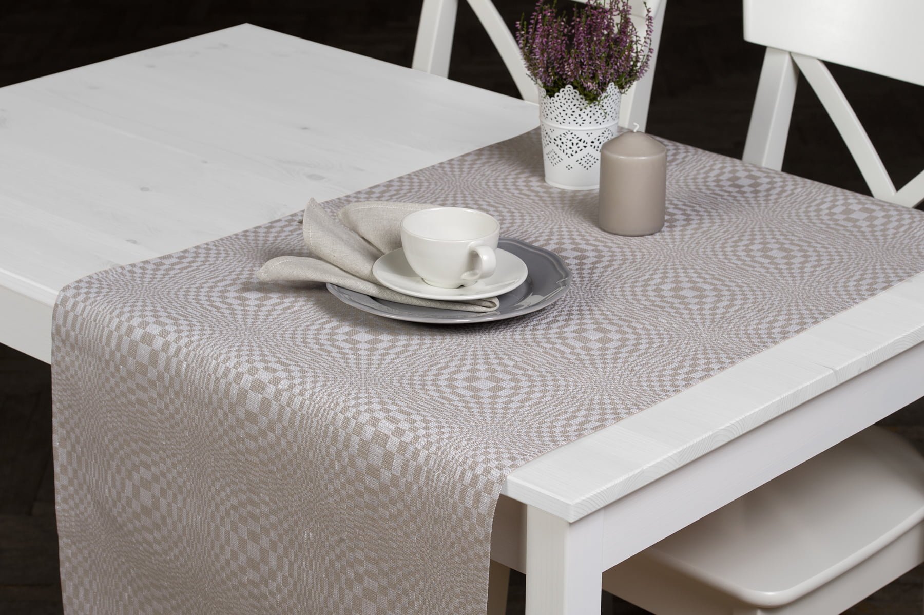 Lino / medvilnės stalo takelio pilkų ir baltų langelių raštas sukuria optinės iliuzijos vaizdą. Visi kraštai dailiai apsiūti. Su šiuo takeliu lengvai ir greitai papuošite pietų stalą.