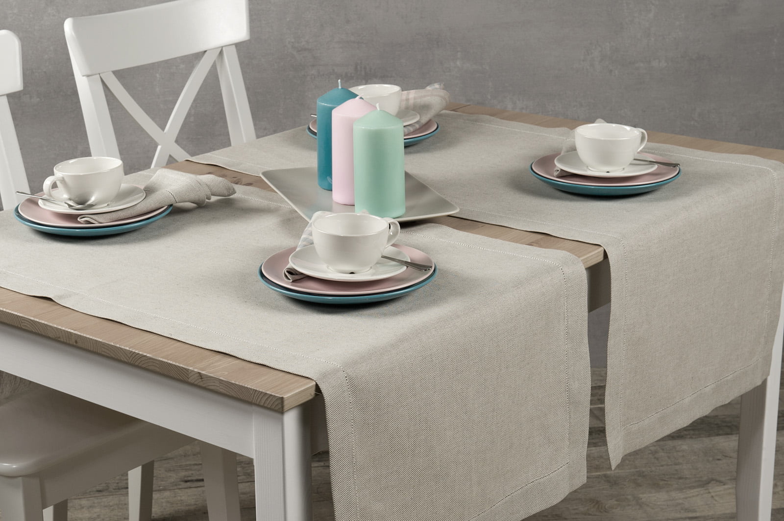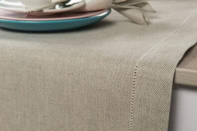 Šviesiai pilkas lino - medvilnės audinio stalo takelis. Gaminio audinys austas ruoželiais iš natūralios pilkos spalvos (nedažytų) lininių ir baltų medvilnės verpalų. Krašteliai plačiai palenkti ir dailiai mereškuoti viena eilute. Jei mėgstate eleganciją, klasikinį dizainą ir ramias, natūralias spalvas, šis takelis turėtų Jums patikti.