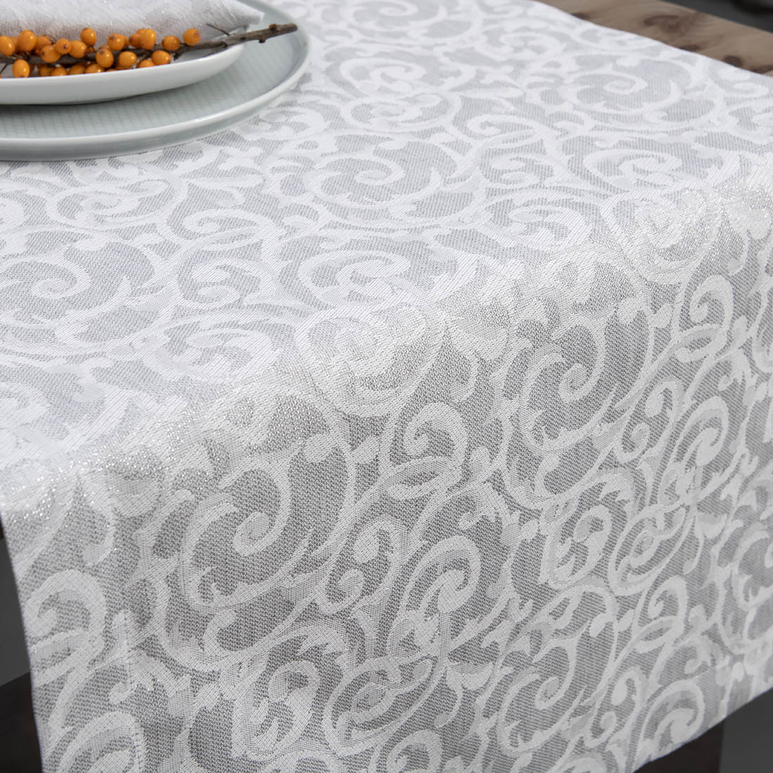 Puslininis šviesiai pilkas raštuotas takelis. Žakardinį šio gaminio audinį išaudėme iš baltų medvilnės ir šviesiai pilkų lininių verpalų, o kad suteiktumėme šventiško blizgesio, dar įaudėme sidabrinės spalvos poliesterio siūlų. Šviesiai pilki šerkšno raštai dailiai žiūrisi tamsesniame pilkame sidabru pagyvintame fone, sukuria žiemišką nuotaiką.