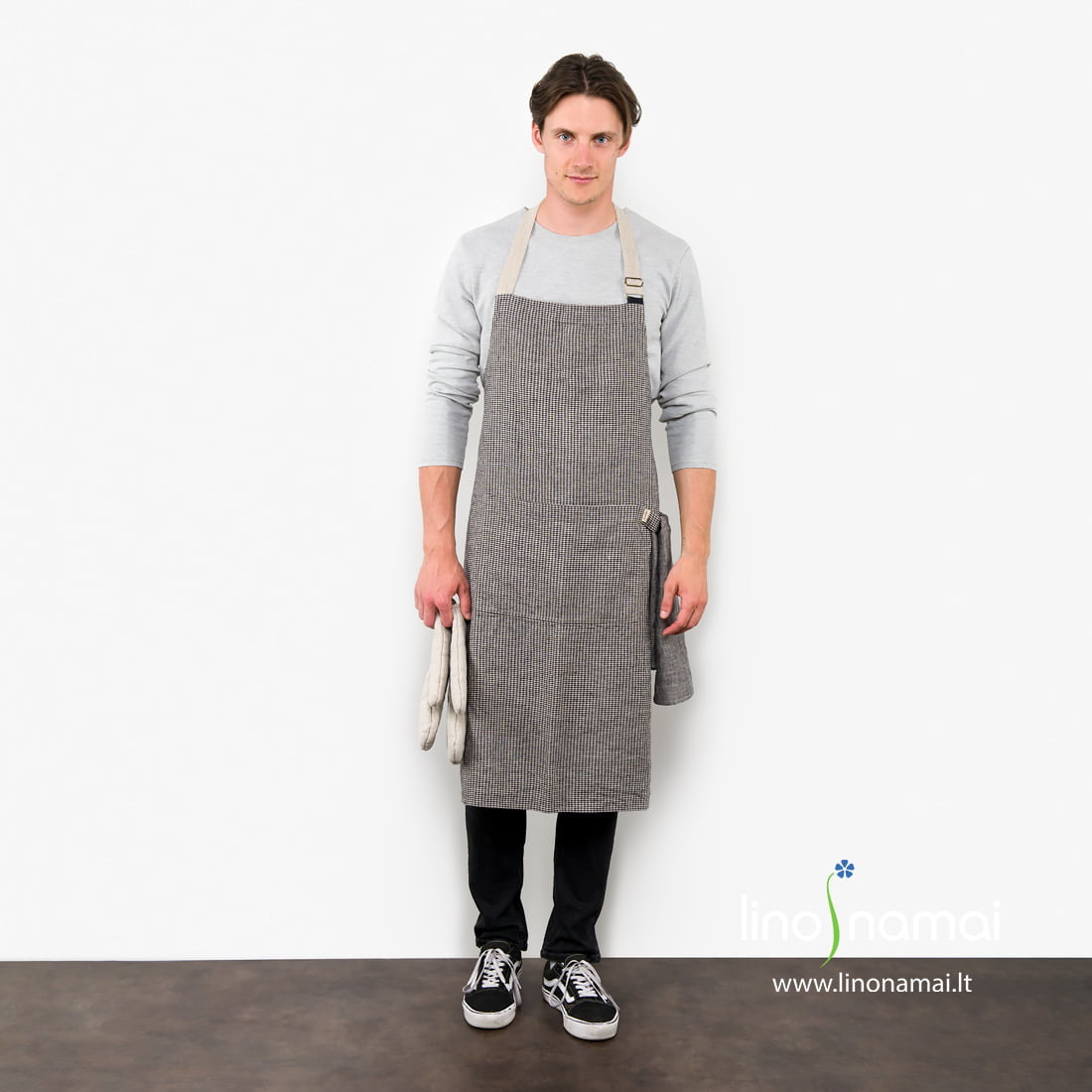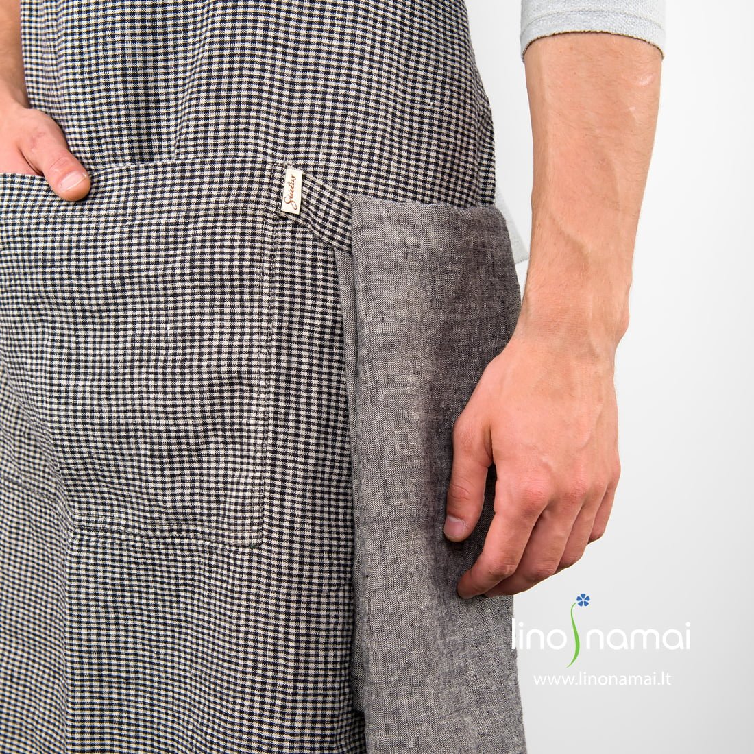 Lininė prijuostė mažais pilkais (iš nedažytų lininių verpalų), juodais langeliais. Juosmens ir reguliuojamo ilgio kaklo dirželį pasiuvome iš natūralios pilkos spalvos lininio audinio ir pritvirtinome prie prijuostės juoda kilpute. Gaminio priekyje didelė talpi kišenė - reikalingos smulkmenos turės savo vietą. Ir dar juostelė rankšluosčiui, kuris patogiai permestas, bus visad po ranka. Prijuostę pasiuvome iš minkšto skalbto audinio, kuris nebesitrauks. Jei turite draugą, kuris mėgsta eksperimentuoti virtuvėje, jį tikrai nudžiugins padovanota prijuostė. Pridėkite ir porą tinkančių virtuvinių rankšluostėlių!