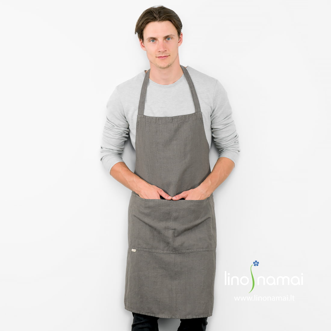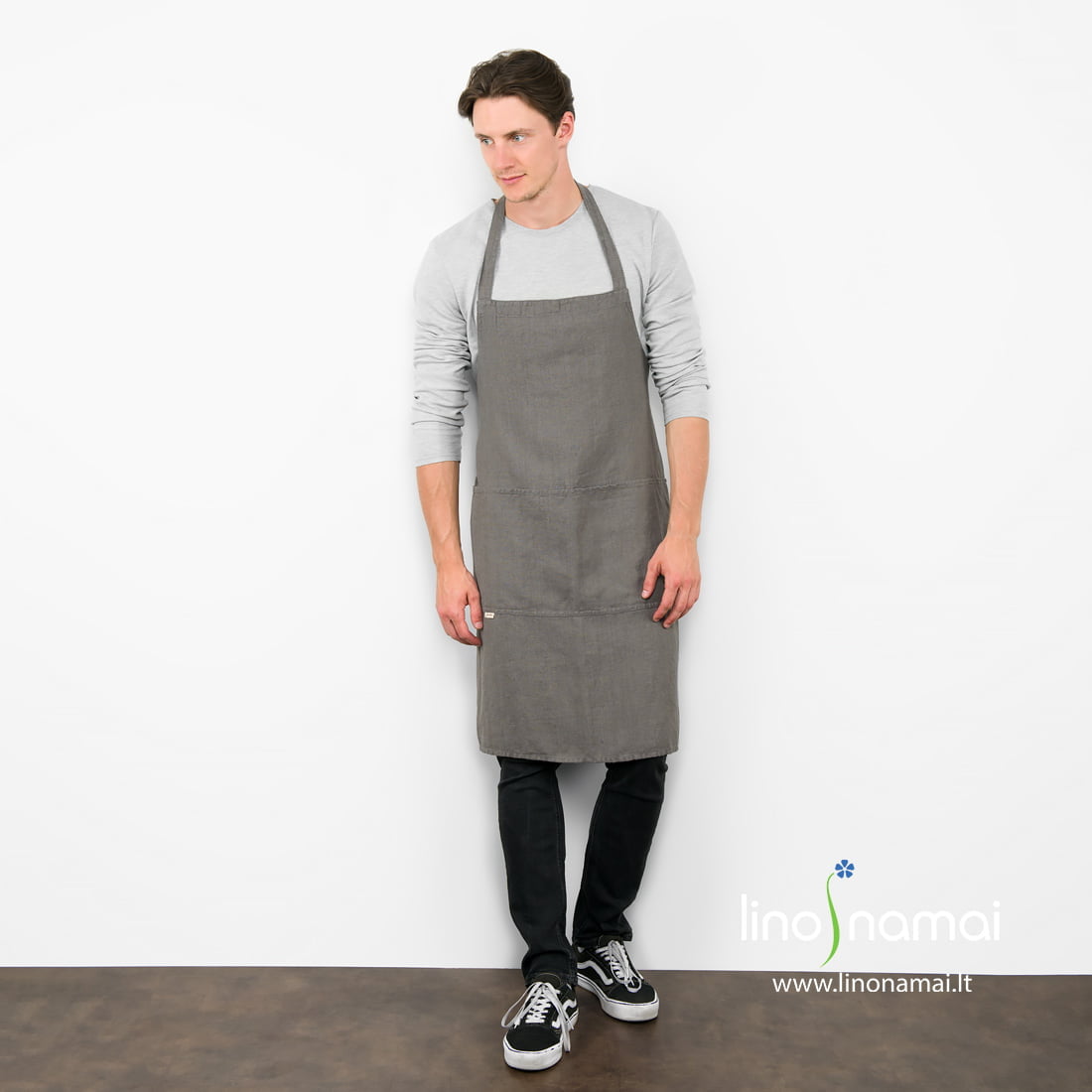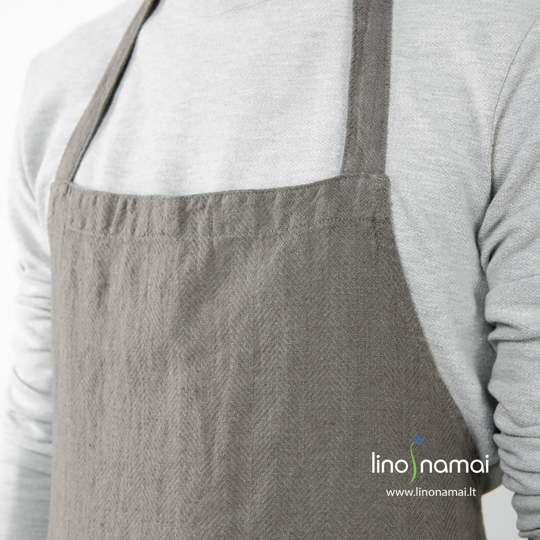 Lininė tamsiai pilka raštuota prijuostė iš puslininio (lino-medvilnės) audinio, austo plačia „eglute“ iš dviejų atspalvių pilkų verpalų. Priekyje per visą prijuostės plotį prisiuvome didelę talpią kišenę susidėti viskam, ką būtina turėti po ranka gaminant. Prieš siūdami prijuostę jos audinį išskalbėme specialia technologija, todėl ji minkšta, švelni, šiek tiek nelygaus paviršiaus. Elegantiška ir maloni dėvėti virtuvės prijuostė tikrai Jus paskatins daugiau laiko praleisti virtuvėje ir gaminti su gera nuotaika.