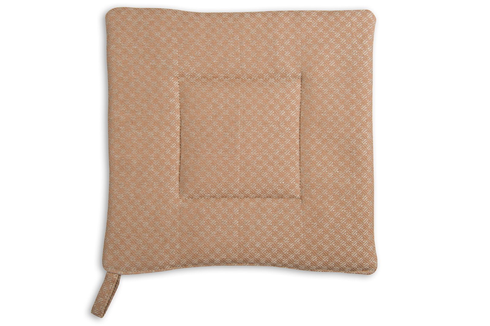 Puodkėlė pasiūta iš puslininio audinio, austo smulkių langelių raštu iš šviesiai rudų medvilnės ir natūralios pilkos spalvos (nedažytų) lininių verpalų. Viduje įsiūtas medvilninis vatinas, todėl gaminys atsparus karščiui. Kampe prisiūta kilputė pakabinimui. Įsigykite ir derančią virtuvinę pirštinę - gaminkite saugiai ir patogiai!