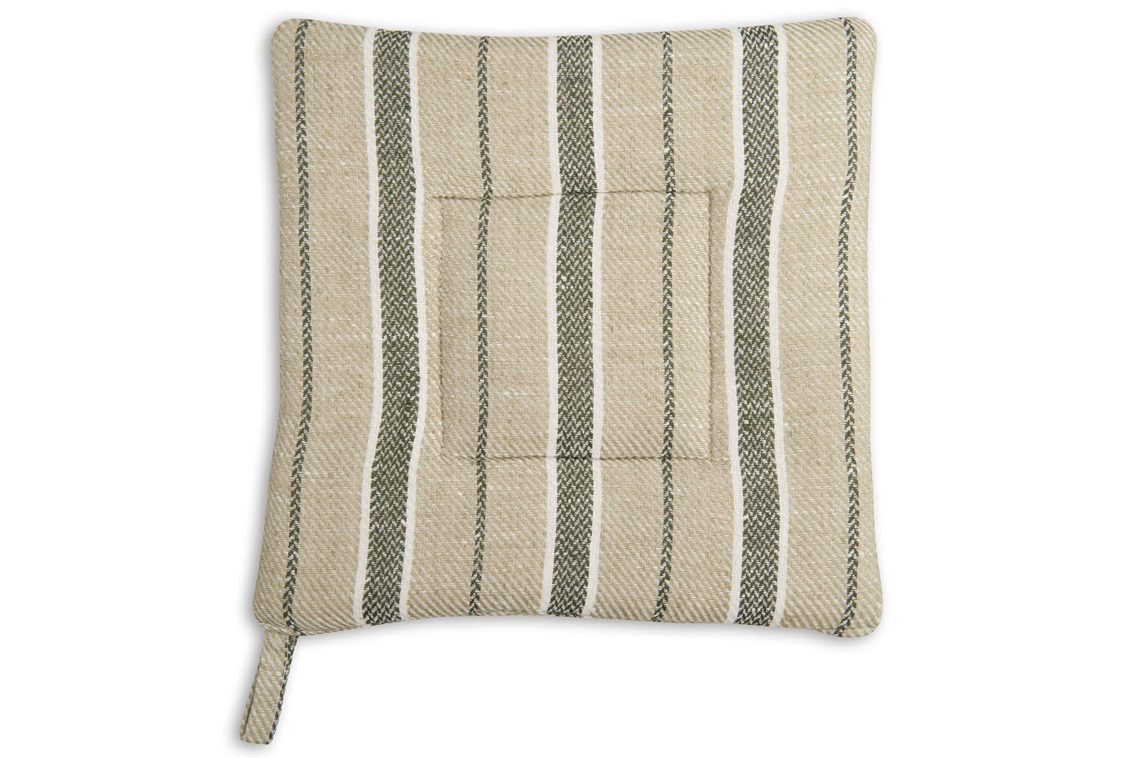 Žalsva lininė puodkėlė su tamsiai žaliomis ir baltomis skirtingo pločio juostelėmis. Tvirtas, patvarus gaminio audinys austas įstrižais ruoželiais. Puodkėlė atspari karščiui, su medvilnės vatinu viduje.