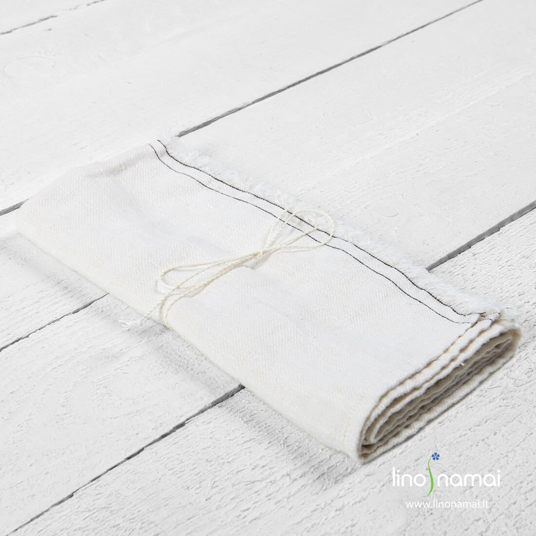 Pieno baltumo (gelsvai baltas) lininis virtuvės rankšluostis su trumpais (1,5cm) pešiotais kutais vienoje trumpojoje kraštinėje ir žvilgsnį traukiančiu dvigubu rudų siūlų peltakiu. Prieš siūdami gaminį, jo audinį išskalbėme, kad jis taptų minkštas, švelnus. Rankšluostuką perrišome balta linine virvele. Šeimininkaujant virtuvėje tegul Jus džiugins lino švelnumas!