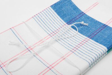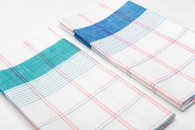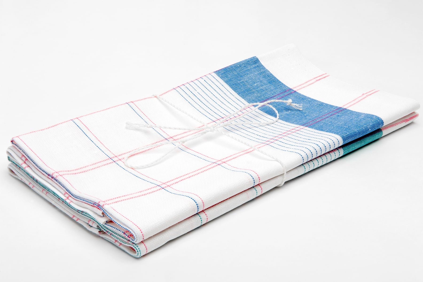 Dviejų ryškiai baltų puslininių languotų rankšluosčių rinkinys. Derantis tarpusavyje rankšluostukai: vienas su žaliais, kitas - mėlynais dominuojančiais dryžiais. Pasiūti iš lino / medvilnės audinio, tad puikiai tinka sausinti indus, šluostyti rankas, o tai pat pagelbės imant karštus indus ar puodus. Šis rinkinys surištas balta dekoratyvine virvele.