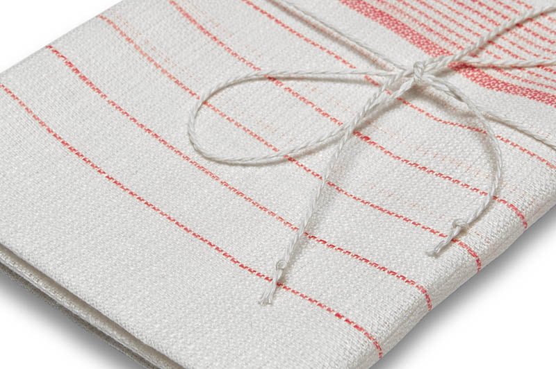 Pieno baltumo gryno lino virtuvės rankšluostis įvairiais raudonos spalvos dryžiais. Specialaus „vaflinio“ rašto dėka, rankšluostukas tapo švelnesnis, minkštesnis bei dar efektyviau sugeriantis drėgmę. Išsiskiria aukšta kokybe bei ilgai dėvisi - netruks patapti nepakeičiamu jūsų namų ruošos pagalbininku.