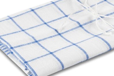 Lininis baltas virtuvės rankšluostukas "Panemunis" mėlynais langeliais. Išsiskiria aukšta kokybe, puikiai sugeria drėgmę, ilgai dėvisi, todėl nepakeičiamas virtuvėje ar buityje.