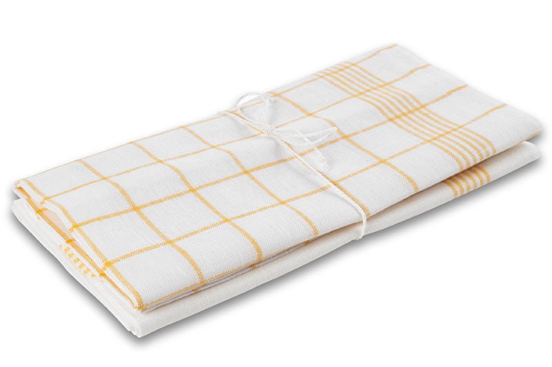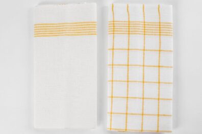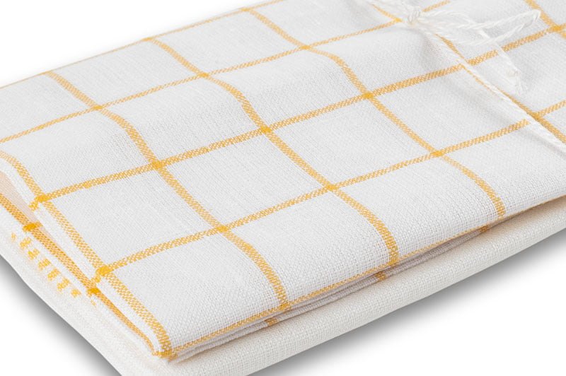 Dviejų baltų gryno lino virtuvės rankšluosčių rinkinys „Veiveriai“: vienas jų su klasikiniu geltonų langelių raštu bei dryžuotomis ilgosiomis kraštinėmis; kitas - tik su geltonais dryželiais. Išsiskiria aukšta kokybe, puikiai sugeria drėgmę, ilgai dėvisi - yra tiesiog nepakeičiami virtuvėje ir buityje.