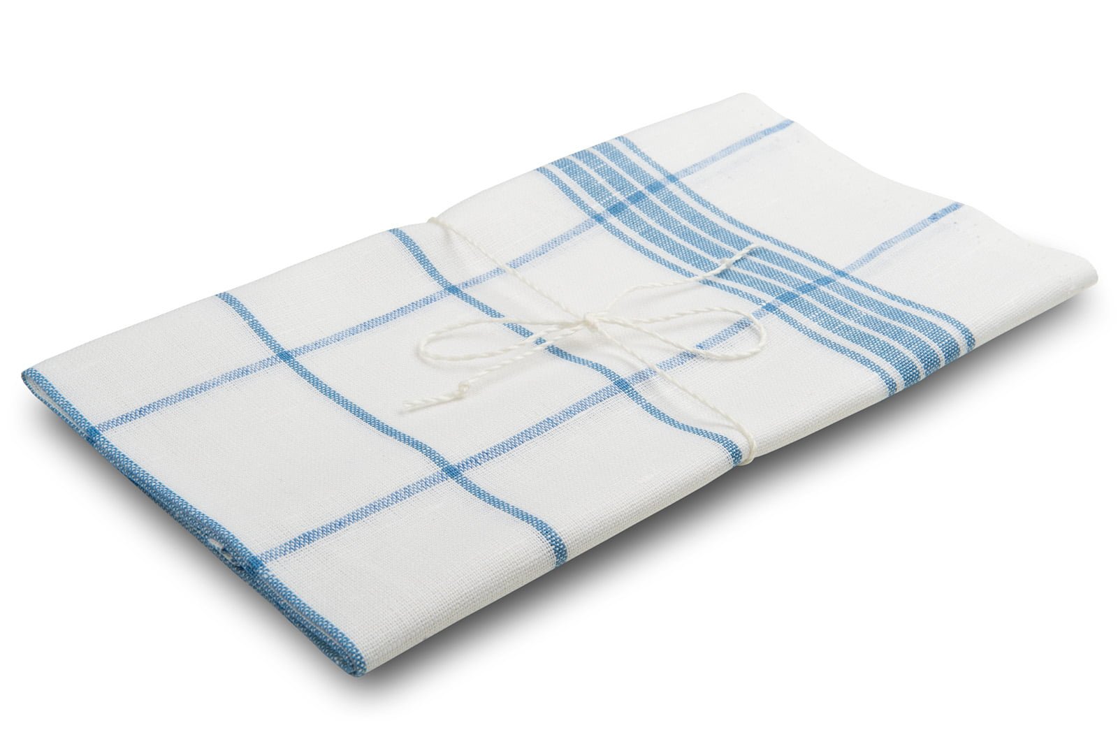 Lino-medvilnės audinio virtuvinis rankšluostis languotas mėlynais langeliais ryškiai baltame fone. Trumposios kraštinės apsiūtos. Gaminys perrištas linine virvute. Tvirtas, patvarus rankšluostukas po kelių skalbimų suminkštės, nereikalaus ypatingos priežiūros, ilgai tarnaus. Pats geriausias pasirinkimas virtuvei!